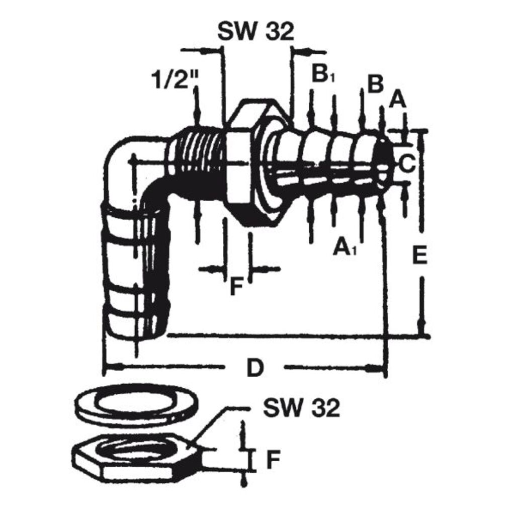 Winkel-Durchführung für Frischwassertanks mit Schlauchanschluss für 10 und 12 mm Schläuche. Mit Dichtung.