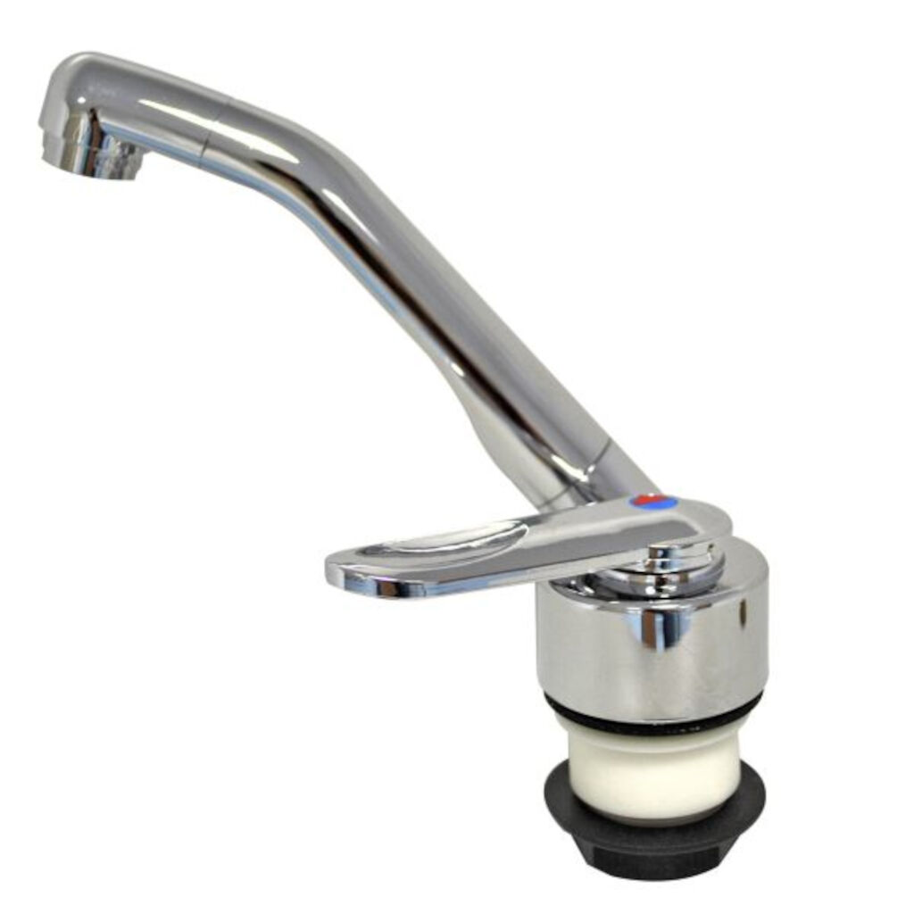 Küchenarmatur für Wohnwagen und Wohnmobil von der deutschen Firma Comet mit einem 150 mm langen Auslauf, der um 90° schwenkbar ist. Passt auch zu Spülen mit Deckel mit einer Höhe von 40 mm im abgesenkten Zustand. Eine keramische Kartusche sorgt für eine lange Lebensdauer und kann bei Dichtungsproblemen einfach ausgetauscht werden.