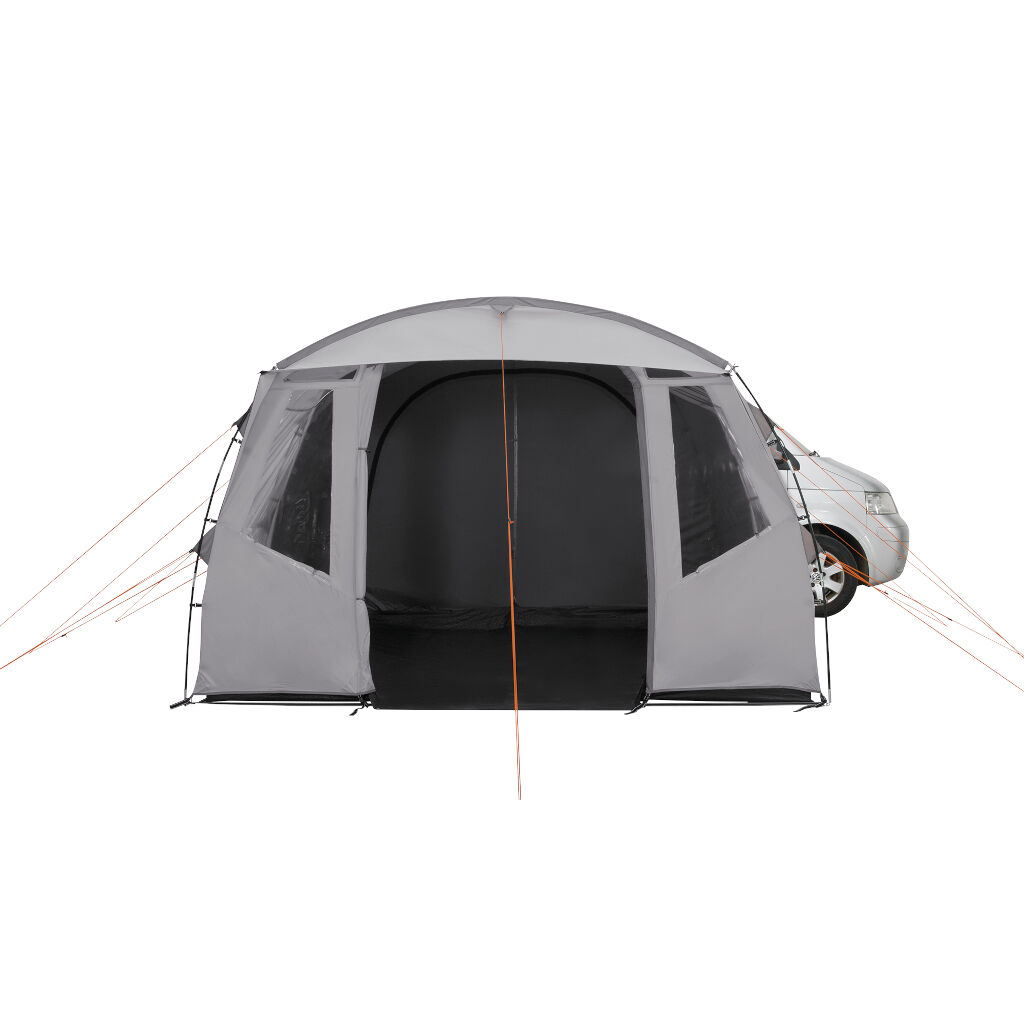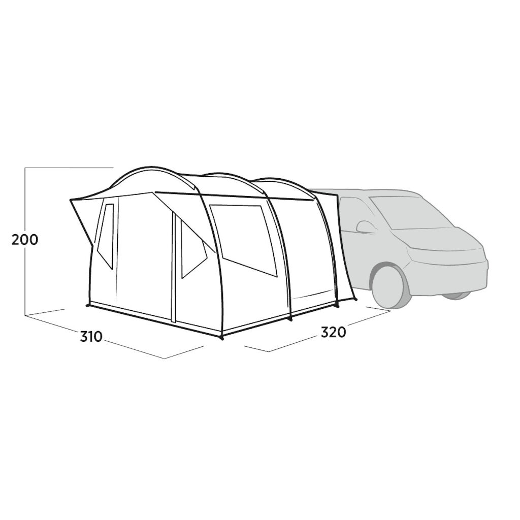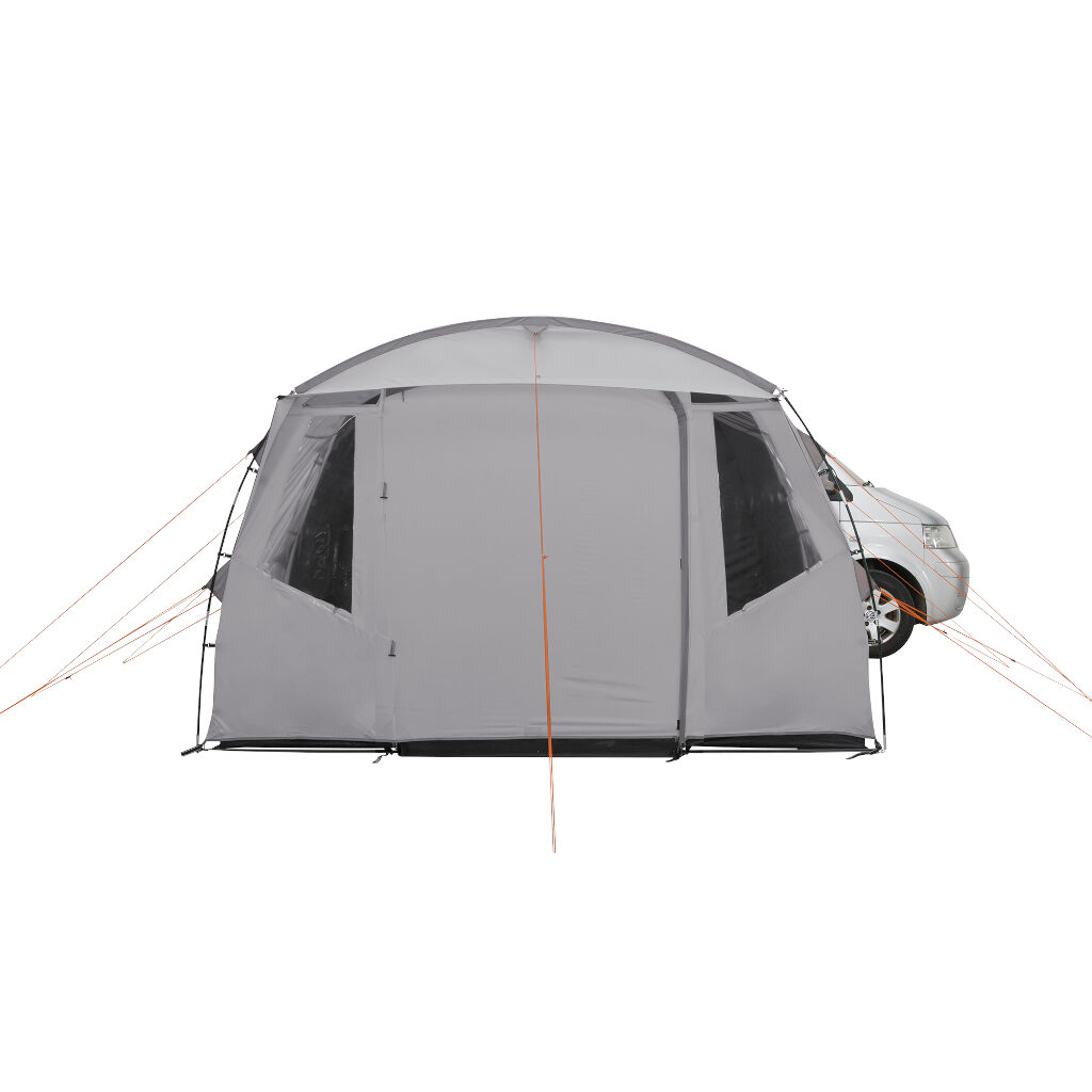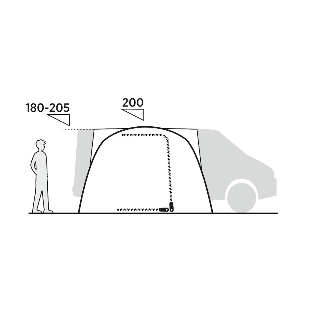 Praktisches und freistehendes Busvorzelt, das für Minivans, Autos und Wohnmobile geeignet ist. Es kann problemlos mit einem Innenzelt für zwei Personen ergänzt werden und schafft so einen komfortablen zusätzlichen Raum beim Camping. Das Vorzelt wird über einen praktischen Schleusenanschluss mit dem Fahrzeug verbunden, der vor Regen und Wind schützt, und verfügt über eine separate Tür, um den Bereich zwischen Auto und Zelt zu schließen. Perfekt für Tagesausflüge, da das Zelt auf dem Campingplatz stehen bleiben kann, während das Auto genutzt wird. Geeignet für Fahrzeuge mit einer Höhe zwischen 180 und 205 cm.