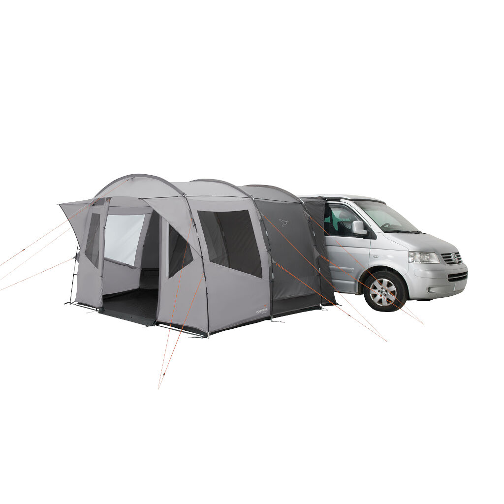 Easy Camp Reine ist ein Busvorzelt, das für Autos, Minivans und kleinere Wohnmobile geeignet ist. Die Tunnelkonstruktion in Kombination mit zwei Längsstangen sorgt dafür, dass das Zelt auch dann stehen bleibt, wenn das Fahrzeug genutzt wird. Einfach die Schleuse lösen und die Tür zwischen Zelt und Fahrzeug schließen.