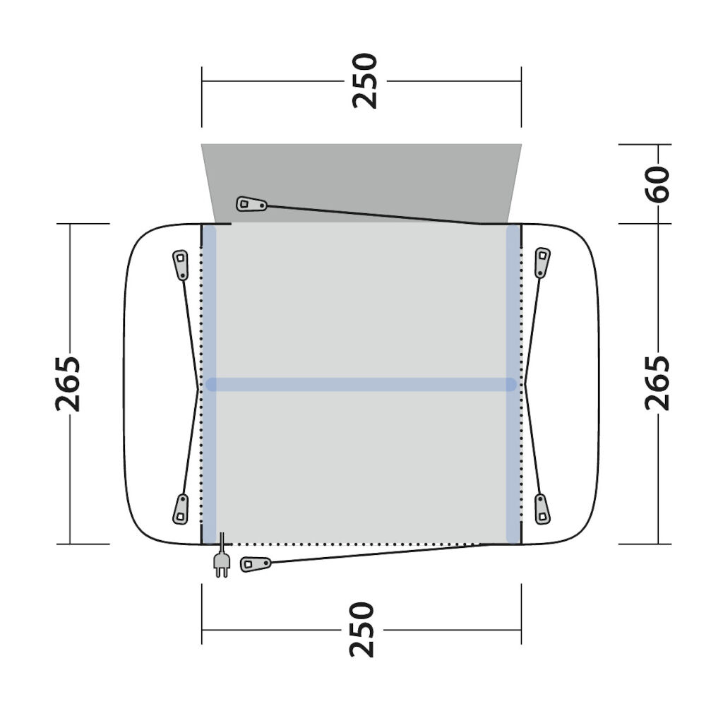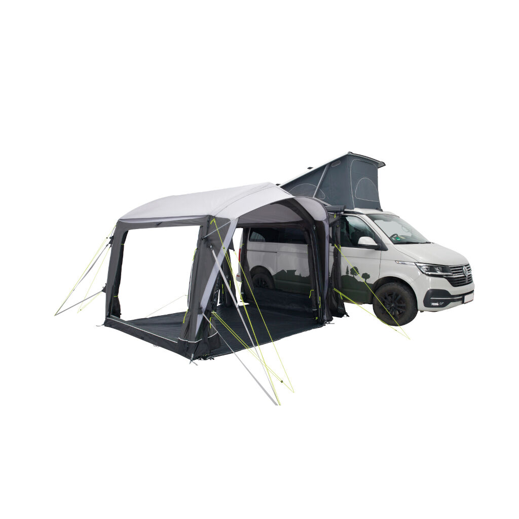 Das Outwell Crossville 250SA ist ein Autovorzelt mit Luftkanälen von der dänischen Marke Outwell. Das Zelt ist extrem einfach aufzubauen und eignet sich für Autos mit einer Höhe zwischen 175 und 200 cm bis zum Dach, Dachträger oder Kederschiene. Befestigen Sie einfach die Zeltplane am Boden mit dem Schleusenbereich zum Auto, pumpen Sie die in die Zeltplane integrierten Kanäle auf, die den Rahmen des Zeltes bilden. Befestigen Sie dann das Zelt über die Kederschiene am Auto, am Dach oder mit Seilen über das Auto. Der einzige Stab ist der, der den Schutz an der vorderen Öffnung bildet. Zwei Vorteile des Zeltes im Vergleich zu anderen Zelten sind, dass es entlang des Autos verläuft, sodass man ein wirklich großes Zelt hat, ohne auf den Campingplatz des Nachbarn zu gelangen, und dass es als normales Familienzelt ohne Schleuse verwendet werden kann. Alle Seiten des Zeltes können zurückgerollt werden, um eine völlig offene Terrasse mit Dach zu schaffen, wenn gewünscht.