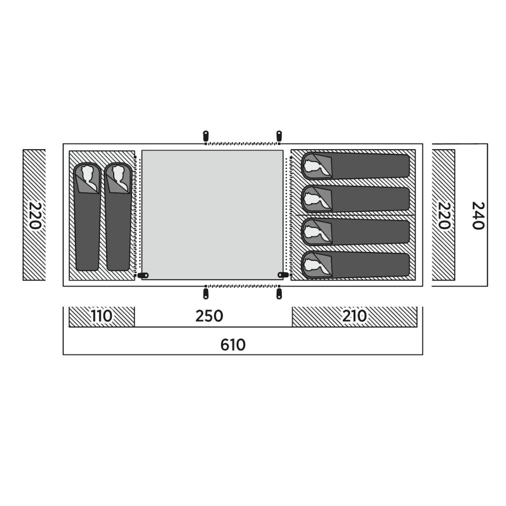 Das Zelt verfügt über drei Schlafkabinen, die in einem vis-à-vis-Design angeordnet sind – zwei auf einer Seite und eine auf der anderen. Die Schlafkabinen sind geräumig und können mit Reißverschluss-Trennwänden unterteilt werden. Dunkle Wände und Decken schützen vor der Morgensonne und sorgen für eine bessere Nachtruhe – ein besonderer Vorteil für Familien mit Kindern.