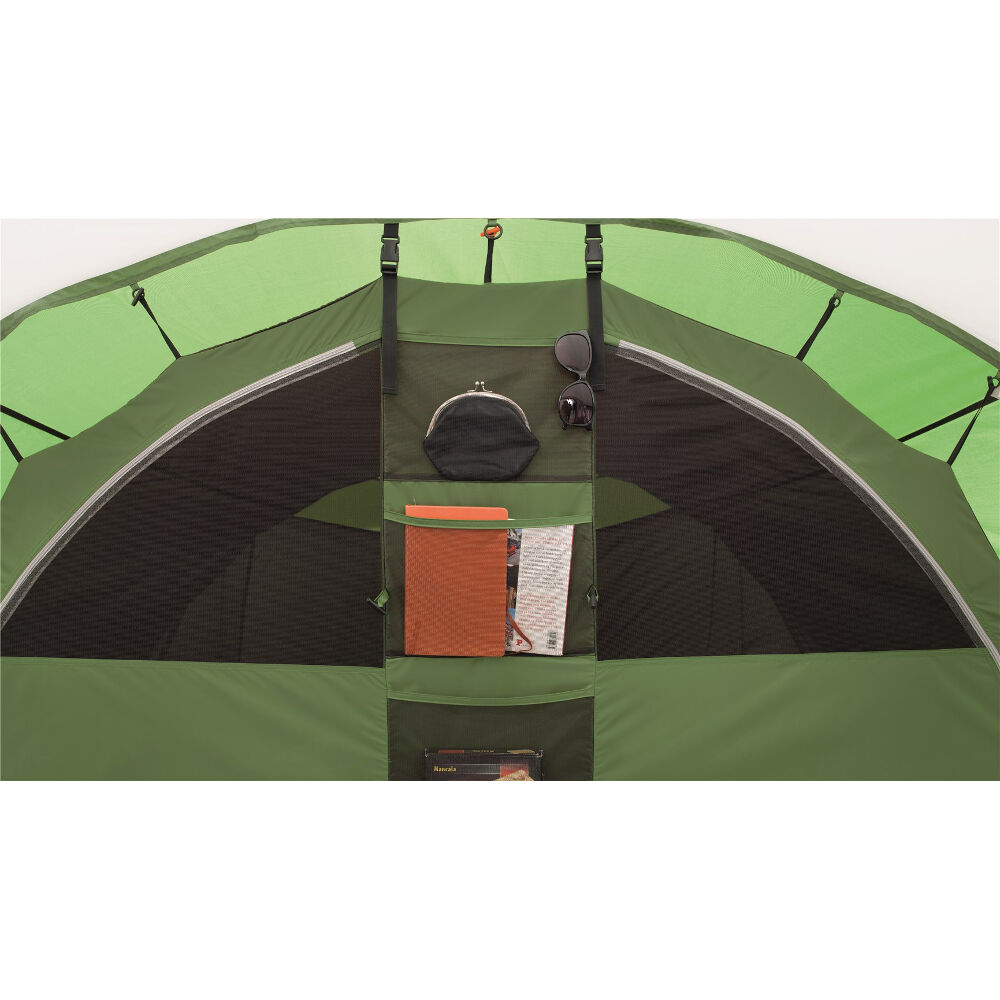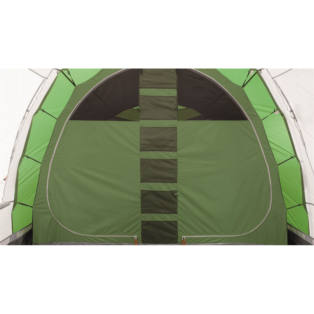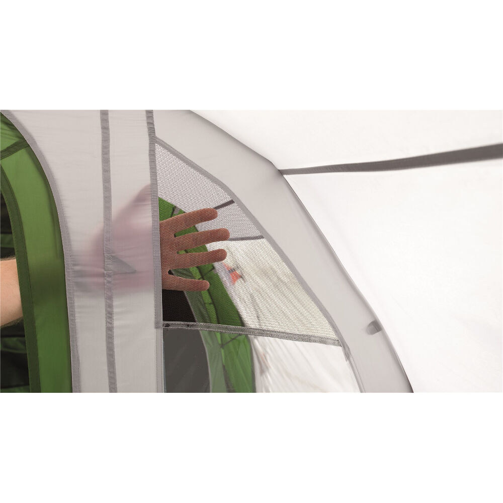 Die Belüftung des Familienzeltes ist großzügig bemessen mit einer großen verstellbaren Lüftung hinter der Schlafkabine und zwei verstellbaren Lüftungen vorne. Die Tür vorne kann ebenfalls komplett geöffnet werden, um zusätzlichen Luftstrom zu schaffen. Dank einer zusätzlichen Netztür kann es auch belüftet werden, wenn kleine Insekten unterwegs sind. Der Sonnenschutz vorne bietet einen guten Schutz vor Regen und Wind für den Eingang, erleichtert das Kochen bei schlechtem Wetter und bietet etwas zusätzlichen Schatten an warmen Tagen. Es kann auch gut zur Aufbewahrung von Schuhen, Spielzeug oder Ausrüstung verwendet werden.