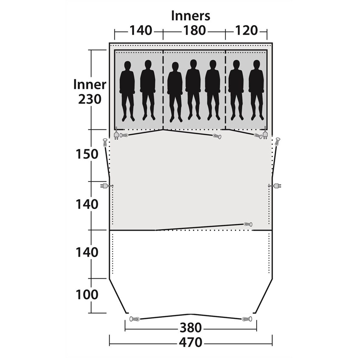 Das Zelt basiert auf drei Zonen. Ein Prinzip, das in England üblich ist und üblicherweise als Außenraum, Innenraum und Schlafzimmer bezeichnet wird. Der Außenraum mit abnehmbarem Boden kann entweder als Essbereich oder zum Aufhängen nasser Kleidung und zur Aufbewahrung von Ausrüstung verwendet werden. Die nächste Zone ist der übliche Wohnraum mit einem vollständig versiegelten Boden, wo man idealerweise Teppiche und Möbel für gesellige Abende oder regnerische Tage platzieren kann, wenn man nicht zu oft in und aus dem Zelt gehen möchte. Die letzte Zone sind dann die Schlafzimmer, bestehend aus drei Schlafzimmern.