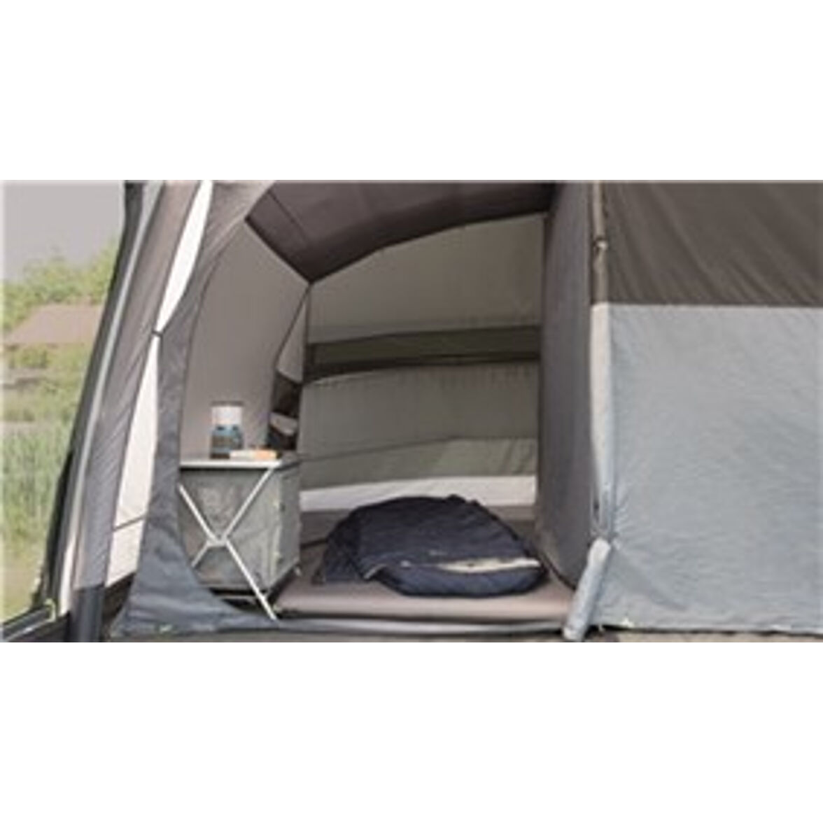 Die Schlafkabine ist in drei Schlafzimmer (2+3+2) unterteilt. Ein einzigartiges Detail ist die extra geräumige Schlafkabine (Outwell Darkend Ambassador Master Bedroom), die zusätzlichen Raum sowohl in der Länge als auch in der Höhe im Vergleich zu normalen Zeltkabinen bietet, wo die Betten den gesamten Raum einnehmen und die Rückwand oft eine niedrige Höhe in großen Teilen des Raumes bietet. Ideal, um Gepäck in die Schlafkabine zu bringen oder einfach etwas mehr Platz zum Bewegen zu haben.