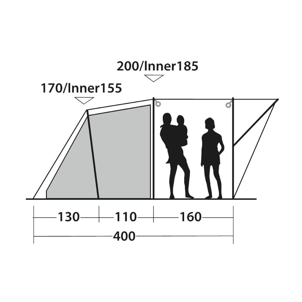 Familienzelt für die aktive Familie, die ein Zelt sucht, das einfach aufzubauen ist, aber Platz bietet, um bei schlechtem Wetter oder am Abend zusammenzukommen. Der festgenähte Boden im gesamten Zelt sorgt für ein gutes Klima im Zelt und schützt vor Zugluft, Feuchtigkeit und Kleintieren. Ein geräumiges Wohnzimmer mit Stehhöhe und Platz für Möbel. Schlafkabine mit zwei Schlafzimmern, bei der die Trennwand geöffnet werden kann, wenn man die Familie in einem großen Schlafzimmer versammeln möchte.