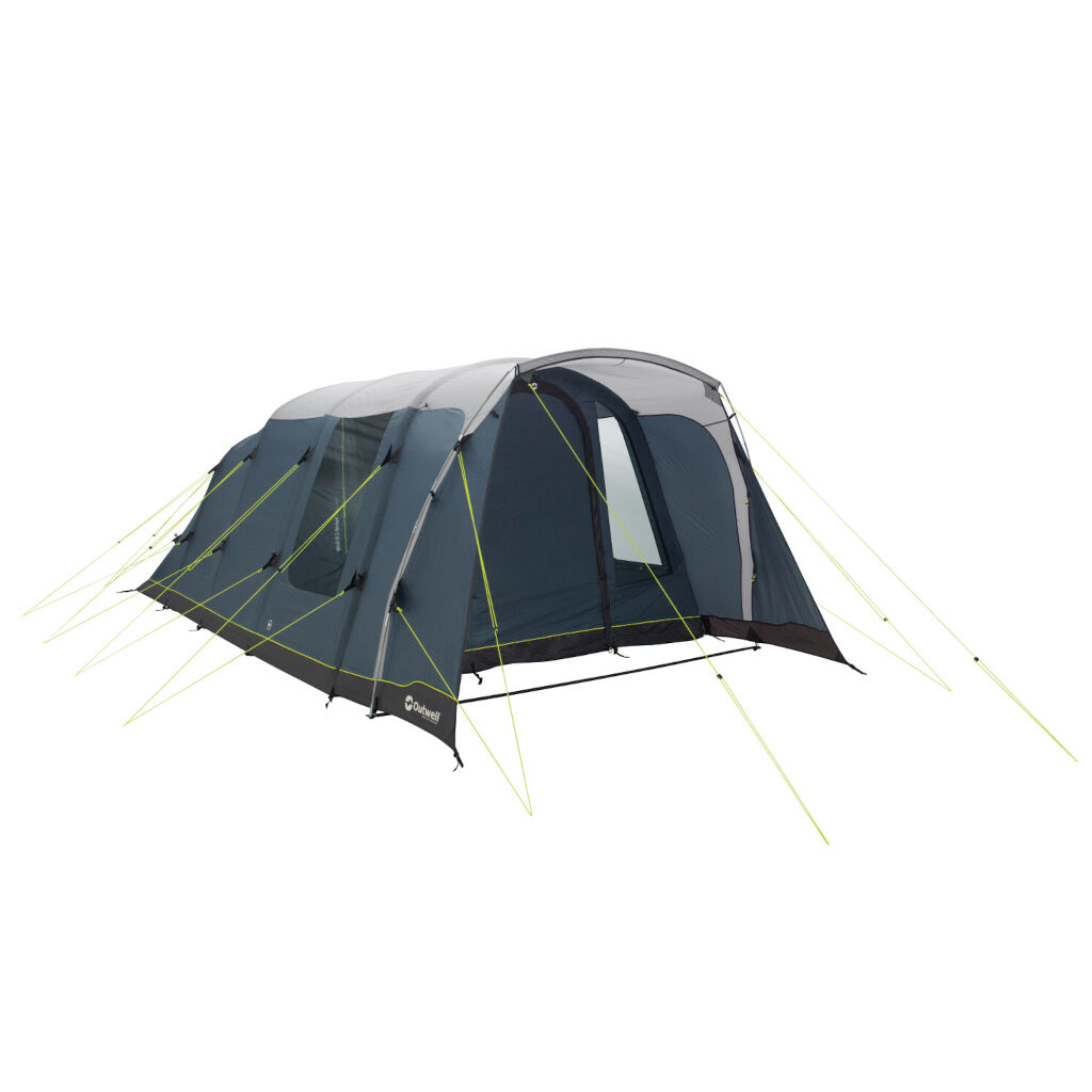 Schnell aufzubauendes und großes 5-Personen-Familienzelt von Outwell, das Luftkanäle anstelle von herkömmlichen Stangen verwendet. Eine Schlafkabine mit geringerem Lichteinfall, die in zwei Schlafzimmer unterteilt werden kann, bietet einen guten Schlafkomfort. Der Wohnbereich bietet Platz für Möbel wie Tische, Stühle und Aufbewahrungsmöbel, ohne eng zu werden, und das Zelt hat auch einen komplett eingenähten Boden, der vor Zugluft, Kleintieren und Kondensation schützt. Das Familienzelt hat eine kleinere Tür an der Seite und eine große geschützte Öffnung vorne, wo man Schuhe und Ausrüstung, die man nicht ins Zelt mitnehmen möchte, abstellen kann.