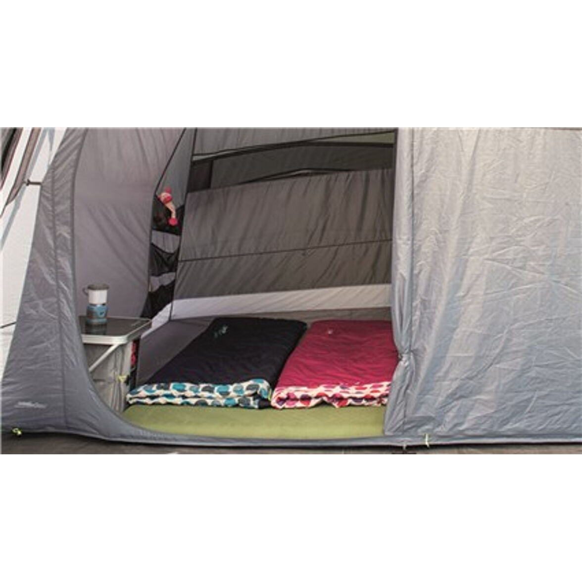 Das Schlafzimmer ist in zwei Schlafzimmer (2+2) unterteilt. Ein einzigartiges Detail ist das extra geräumige Schlafzimmer (Outwell Darkend Ambassador Bedroom), das zusätzlichen Raum sowohl in der Länge als auch in der Höhe im Vergleich zu normalen Zeltschlafkabinen bietet, wo die Betten den gesamten Raum einnehmen und die Rückwand oft eine niedrige Höhe über einen großen Teil des Raumes bietet. Ideal, um Gepäck im Schlafzimmer zu verstauen oder einfach nur etwas mehr Platz zum Bewegen zu haben. Die Wand zwischen den Schlafzimmern kann entfernt werden, wenn man die ganze Familie in einem großen Schlafzimmer zusammenbringen möchte, und die Tür vorne kann vollständig geöffnet werden.