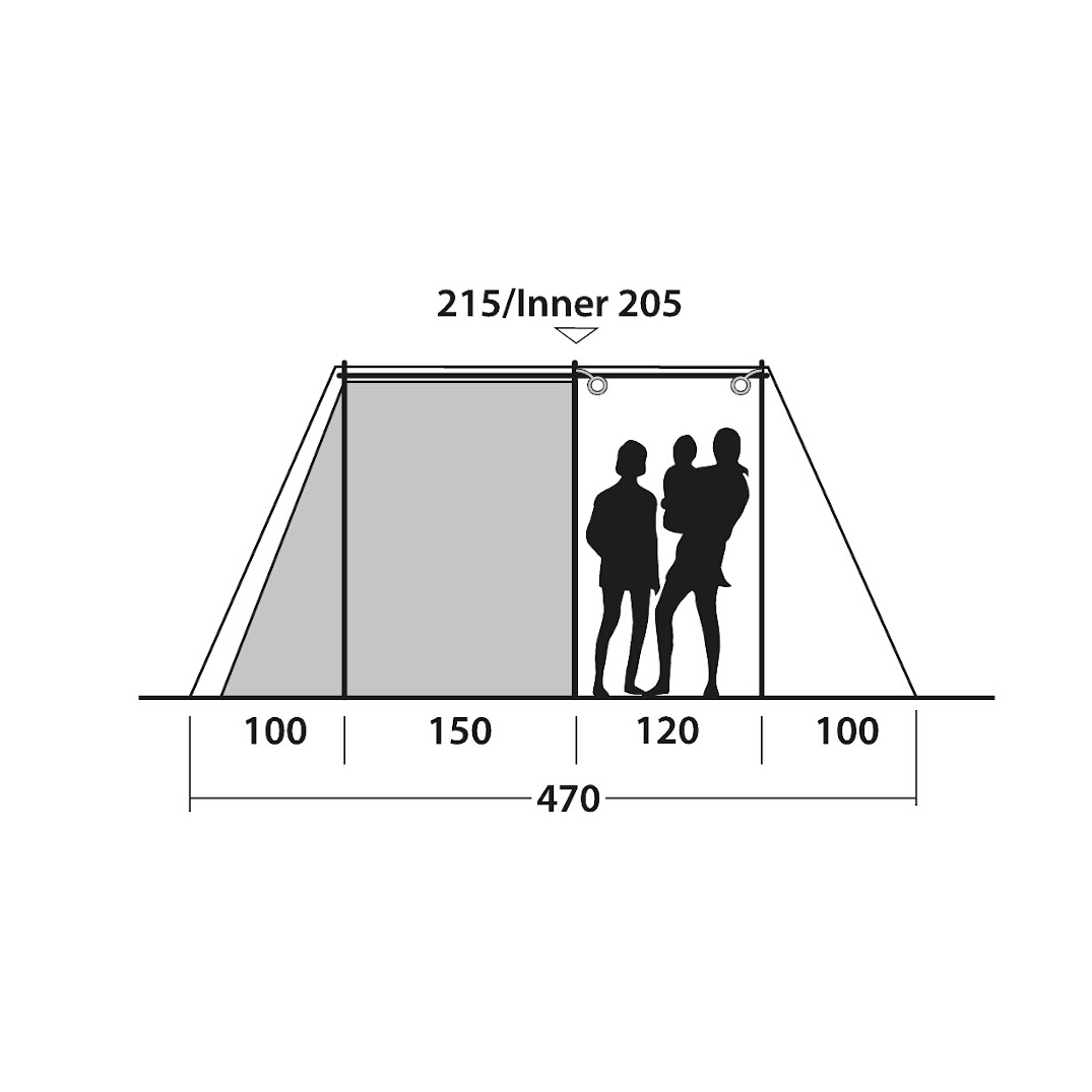 Das Schlafabteil ist in zwei Schlafzimmer unterteilt, mit Platz für zwei Personen in jedem. Ein einzigartiges Detail ist das extra geräumige Schlafabteil (Outwell Ambassador Bedroom), das zusätzlichen Platz sowohl in der Länge als auch in der Höhe im Vergleich zu normalen Zeltkabinen bietet, bei denen die Betten die gesamte Länge einnehmen und die Rückwand oft in großen Teilen des Raumes niedrige Höhe bietet. Perfekt, um Gepäck in das Schlafabteil zu bringen oder einfach, um etwas mehr Platz zum Bewegen zu haben. Die Wand zwischen den Schlafzimmern kann entfernt werden, wenn man die ganze Familie in einem großen Schlafzimmer versammeln möchte.