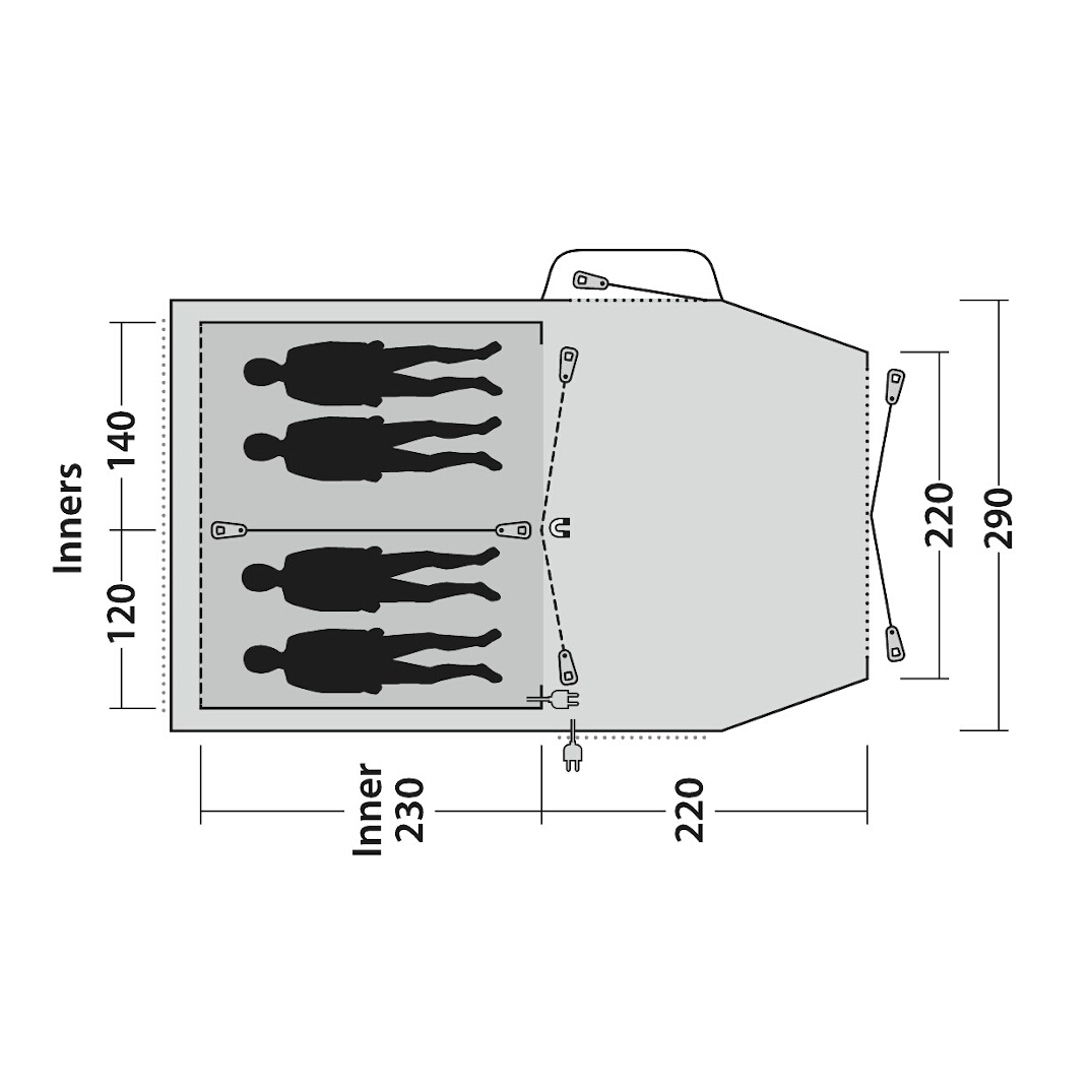 Geräumiges Familienzelt für bis zu vier Personen mit sehr hohem Komfort. Das Zelt verfügt über einen Wohnbereich mit großen getönten Fenstern, zwei größere Schlafzimmer mit gutem Sonnenschutz sowie zwei Eingänge. Robustes Zeltgewebe mit Verstärkungen an kritischen Punkten und Duratec-Glasfaserstangen sorgen für ein Zelt mit langer Lebensdauer, das auch unter schwierigen Bedingungen standhält. Es wurde auf Winde bis zu 24 m/s getestet.