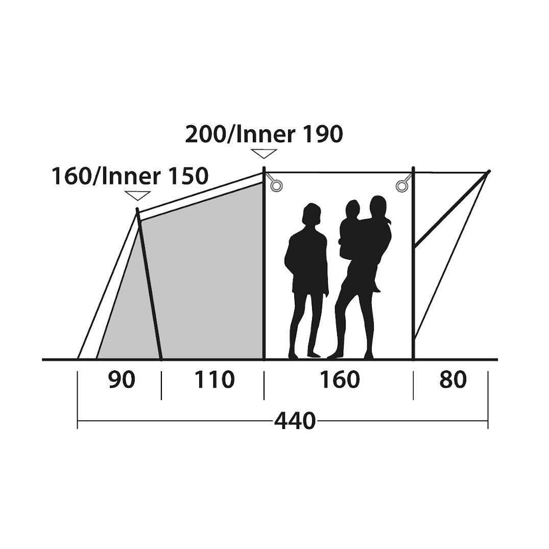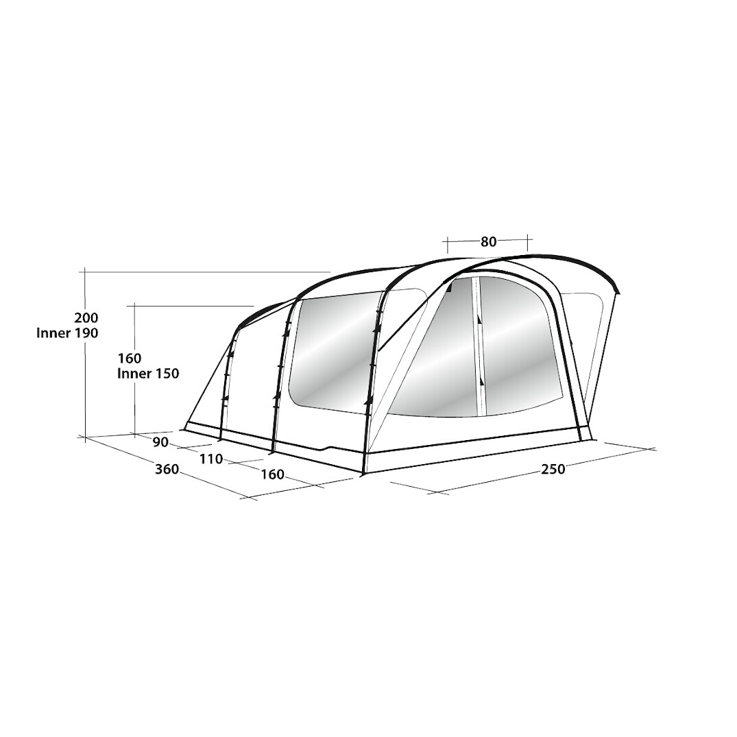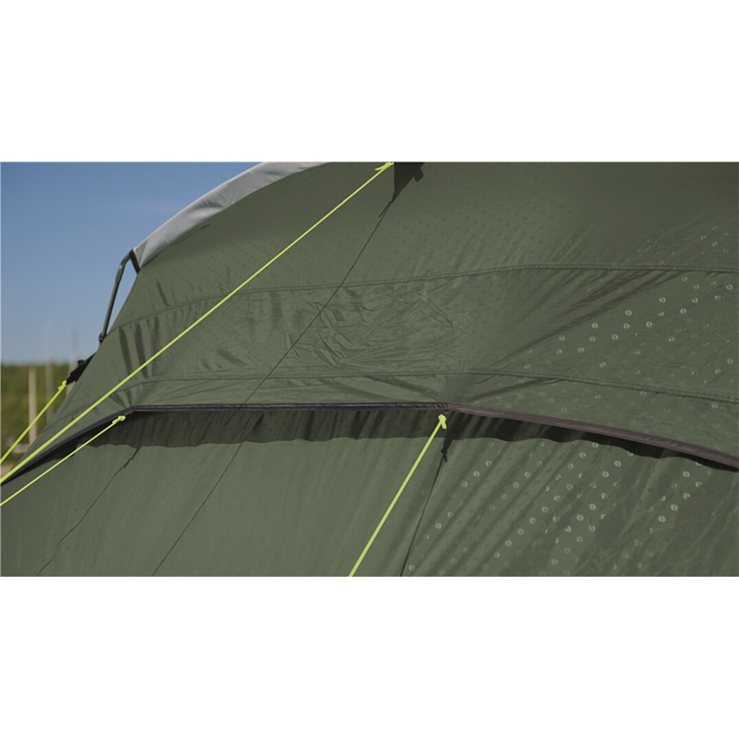 Oakwood 3 hat einen großen regengeschützten Eingang vorne mit einer D-förmigen Tür, die an warmen Tagen vollständig geöffnet werden kann, sodass das Zelt als geschützte Terrasse genutzt werden kann. Das Familienzelt hat auch einen vollständig versiegelten Boden, der an das Außenzelt genäht ist, was das Zelt vor Wind, Insekten und Schmutz schützt.