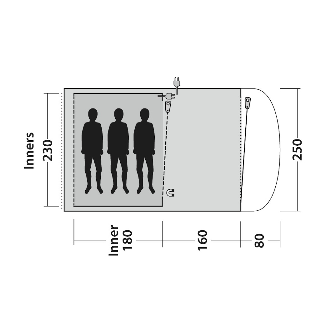 Die Schlafkabine bietet Platz für drei Personen, wird aber auch für zwei Personen empfohlen, da etwas zusätzlicher Platz für Gepäck bleibt. Ein stärkerer dunkler Stoff in der Schlafkabine sowie im Stoff des Außenzeltes über der Schlafkabine verringert die Wirkung des schlimmsten Feindes vieler Zeltcamper, der Morgensonne. Die Schlafkabine hat auch einen Vorhang, der über die Belüftung gerollt werden kann, um das einfallende Licht zu reduzieren.