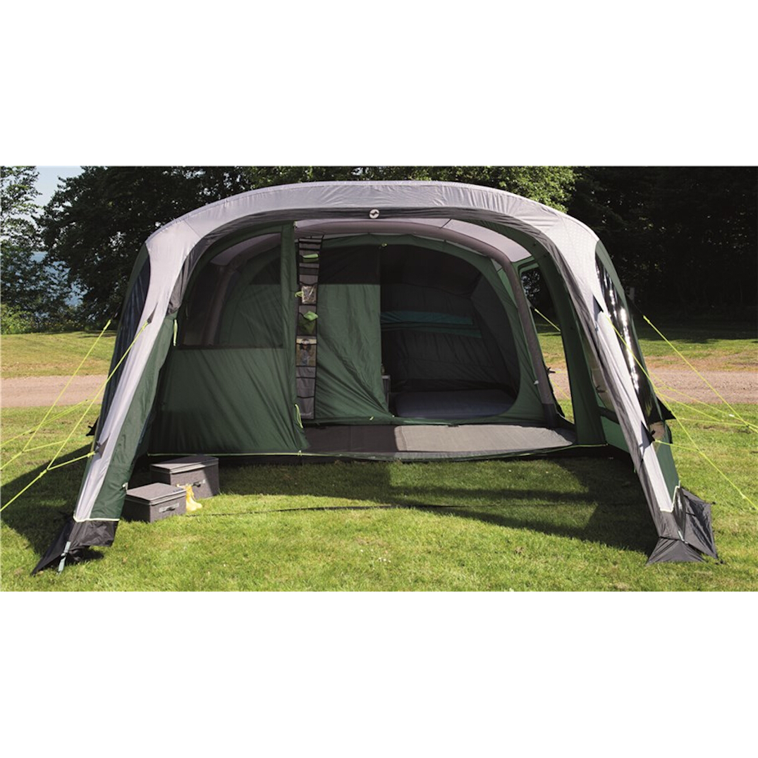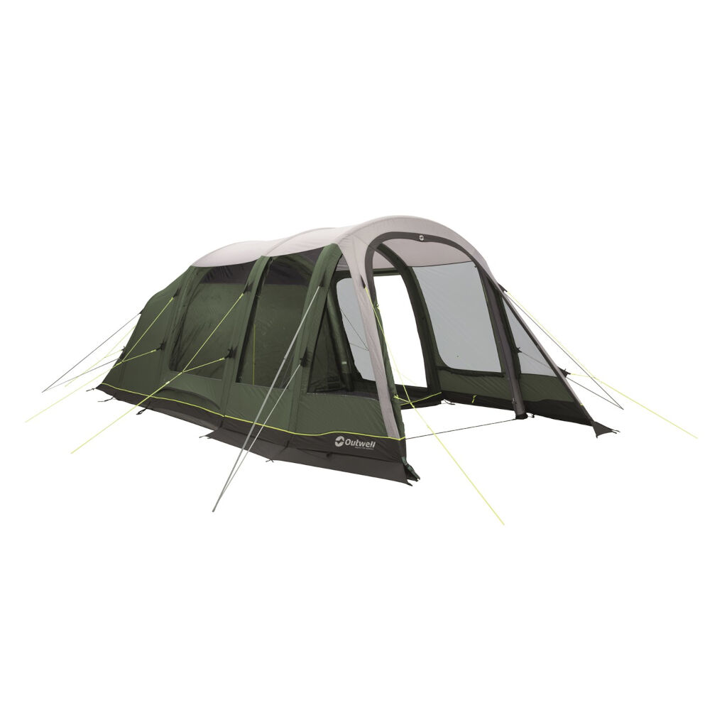 Großes und schnell aufzubauendes 4-Personen-Familienzelt von Outwell, das Luftkanäle anstelle von Stangen verwendet. Zwei dunkle Schlafräume, ein großes Wohnzimmer mit fest angenähtem Boden sowie ein zusätzliches Zimmer an der Vorderseite bieten viel Platz für sowohl die Familie als auch die Ausrüstung. Der Raum vorne hat eine große Tür und kann geöffnet werden, um einen schattigen Platz zu schaffen oder um sich vor Regen und Wind zu schützen. Der Raum an der Vorderseite bietet auch Platz für Ausrüstung, die man bei schlechtem Wetter fernhalten möchte, aber nicht im Zelt haben will.