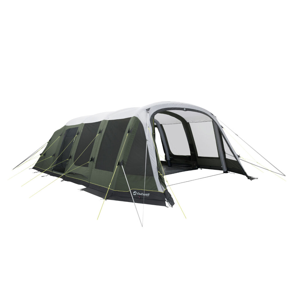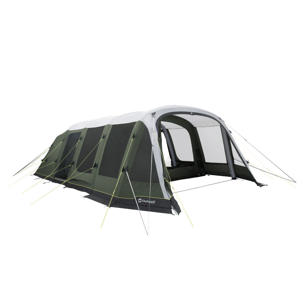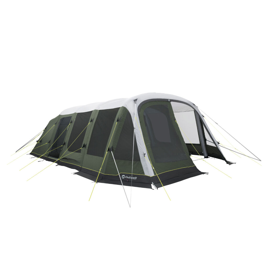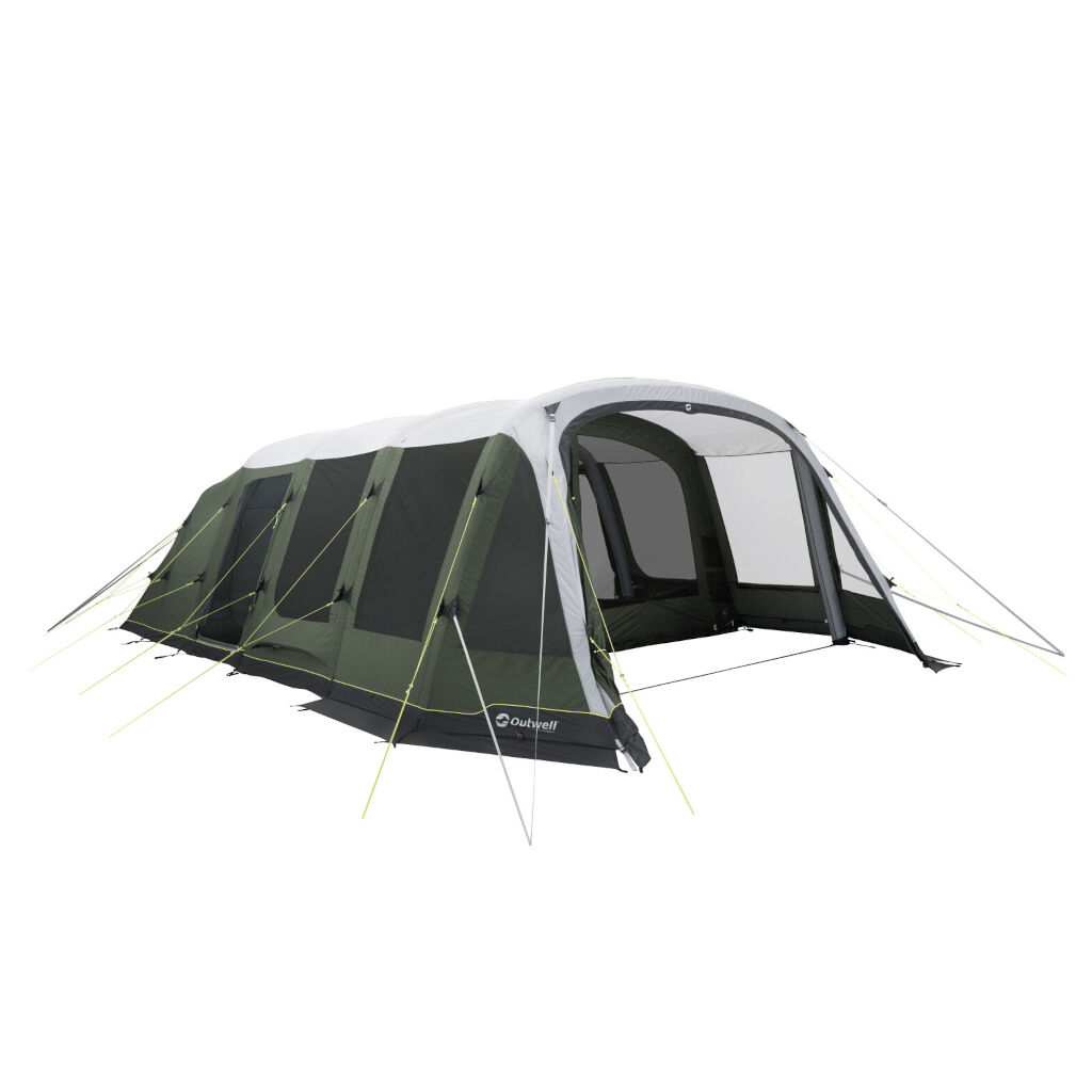 Großes 8-Personen-Familienzelt von der dänischen Marke Outwell, das Luftkanäle anstelle von herkömmlichen Stangen verwendet. Das Zelt verfügt über insgesamt vier Schlafräume, ein großes, helles Wohnzimmer sowie einen zusätzlichen Raum an der Vorderseite. Der zusätzliche Raum vorne ist ohne Boden und kann geöffnet werden, um als geschützter Außenbereich oder als Stauraum für Ausrüstung wie Fahrräder oder Kinderwagen genutzt zu werden. Perfekt für die größere Familie, die Familie mit älteren Kindern, die eigene Schlafzimmer möchten, oder für diejenigen, die einfach ein wirklich geräumiges Campingzelt wünschen.