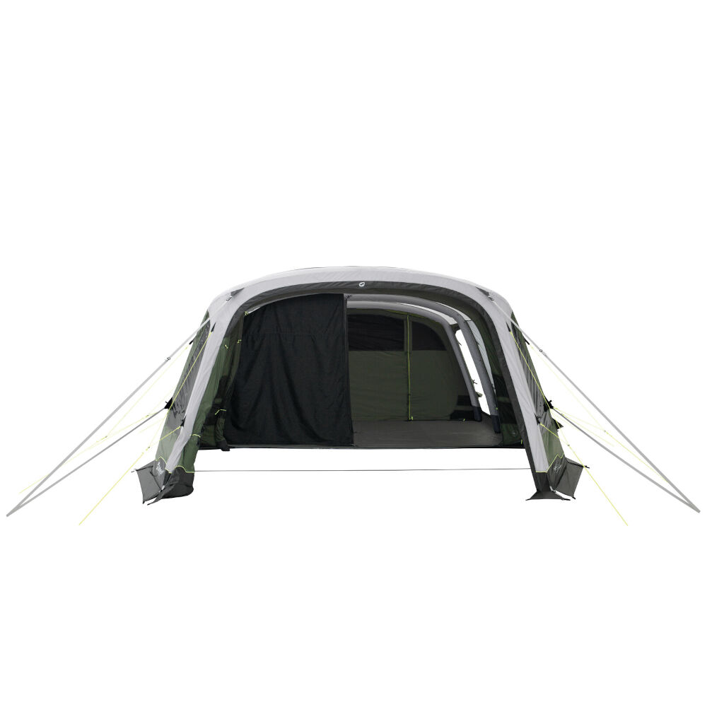 Anstelle von Stangen verwendet das Familienzelt die Rigid Air-Technologie von Outwell, bei der die Stangen durch Luftkanäle ersetzt wurden, um einen einfachen Aufbau zu ermöglichen. Die fünf Kanäle werden einfach über das Ventil am unteren Rand einer Seite des Zeltes aufgepumpt, was sowohl schnell geht als auch den Aufbau erleichtert, wenn das Zelt aufgestellt ist. Neben dem einfachen Aufbau verfügt das Zelt über eine robuste Zeltplane, die nicht nur Regen und Wind standhält, sondern auch weniger raschelt als einfachere Planen, wenn sie sich bewegt. Große Fenster sorgen für ein helles und angenehmes Zelt, und wenn man die Privatsphäre erhöhen möchte, gibt es Vorhänge an allen Fenstern.
