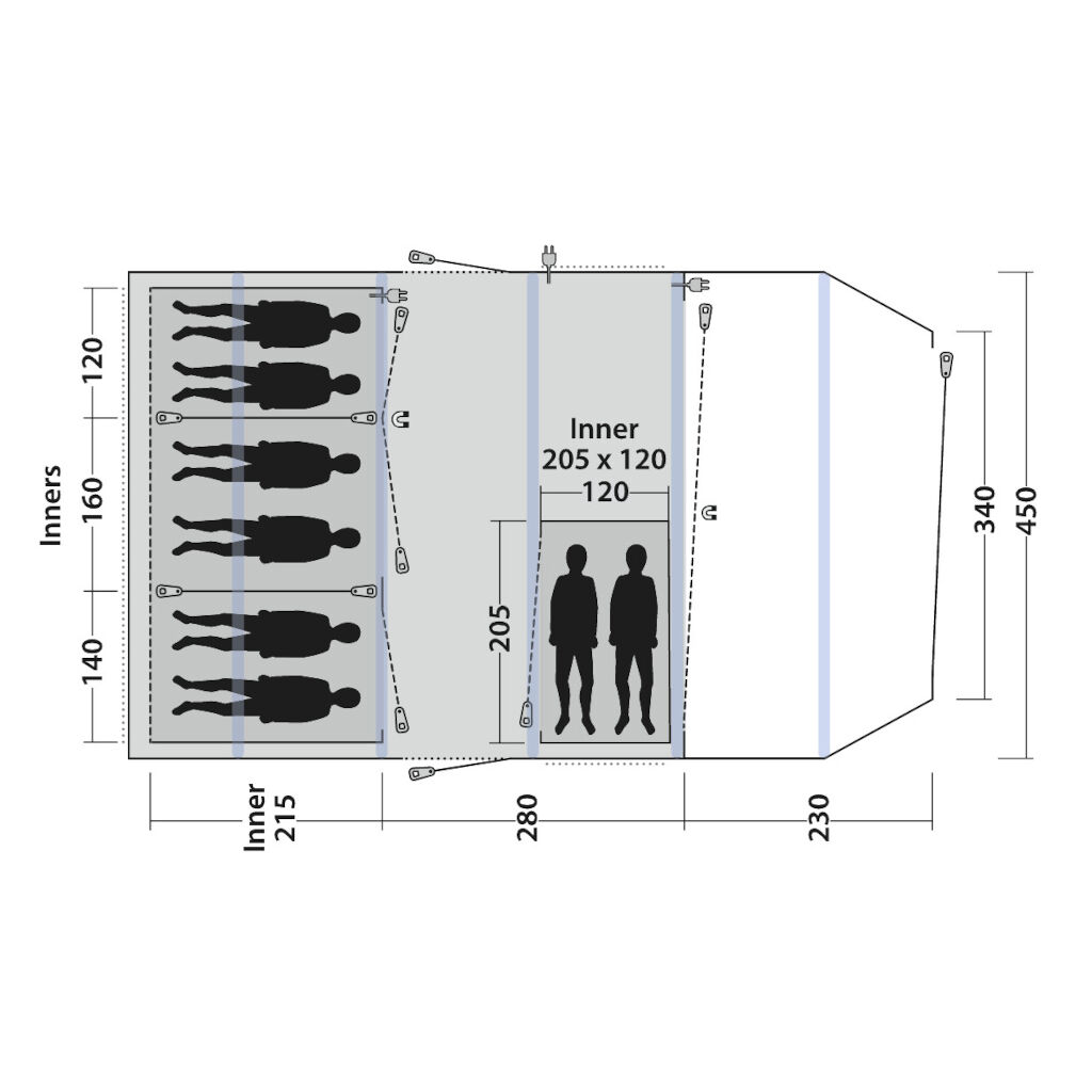 Die große Schlafkabine hinten im Zelt ist in drei Schlafzimmer (2+2+2) unterteilt. Die Wände zwischen den Schlafzimmern können entfernt werden, wenn man die ganze oder Teile der Familie in einem größeren Schlafzimmer zusammenbringen möchte. Die kleinere Schlafkabine im Wohnbereich ist für zwei Personen ausgelegt, und für Familien, die nicht acht Schlafplätze benötigen, kann sie entweder abgebaut, als Gästezimmer genutzt oder zur Aufbewahrung von Ausrüstung verwendet werden. Ein robusterer dunkler Stoff in den Schlafkabinen sowie im Außenzeltstoff über der großen Schlafkabine reduziert die Wirkung des schlimmsten Feindes vieler Zeltcamper, der Morgensonne. Die große Schlafkabine hat auch einen Vorhang, der über die Belüftungsöffnung gerollt werden kann, um das Licht zu reduzieren, das durch die hintere Belüftung des Zeltes eindringt.