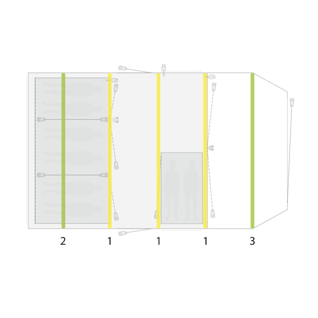 Die Tür zwischen dem Wohnbereich und dem Außenbereich sowie eine Tür in der großen Schlafkabine haben zusätzlich zum Reißverschluss eine Magnetleiste, sodass sie ohne Reißverschluss geöffnet und geschlossen werden können. Eine Lösung, die es erleichtert, sich zwischen den Räumen des Zeltes zu bewegen, in und aus der Schlafkabine zu gelangen, ohne den Rest der Familie zu wecken, sowie in und aus dem Zelt zu gelangen, ohne den Reißverschluss tagsüber verwenden zu müssen (falls die Außentür geöffnet ist).