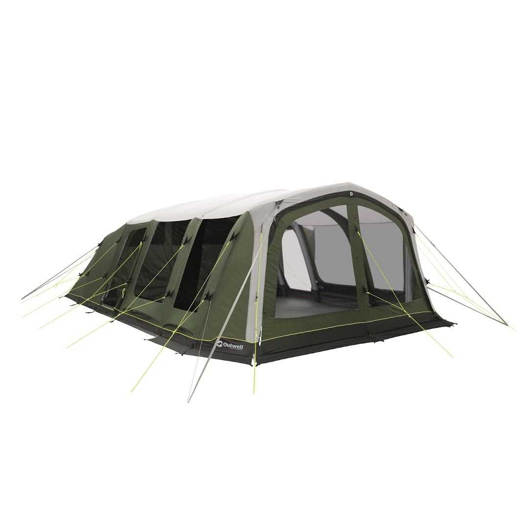 Anstelle von Stangen verwendet das Familienzelt die Rigid Air-Technologie von Outwell, bei der die Stangen durch Luftkanäle ersetzt wurden, um eine einfache Montage zu ermöglichen. Die fünf Kanäle werden einfach über das Ventil am unteren Rand einer Seite des Zeltes aufgepumpt, was sowohl schnell geht als auch ermöglicht, das Zelt alleine aufzubauen. Neben der einfachen Montage hat das Zelt eine robuste Zeltplane, die nicht nur Regen und Wind standhält, sondern auch weniger raschelt als einfachere Planen, wenn sie sich bewegt. Große Fenster sorgen für ein helles und angenehmes Zelt, und wenn man die Einblicke reduzieren möchte, gibt es Vorhänge an allen Fenstern.