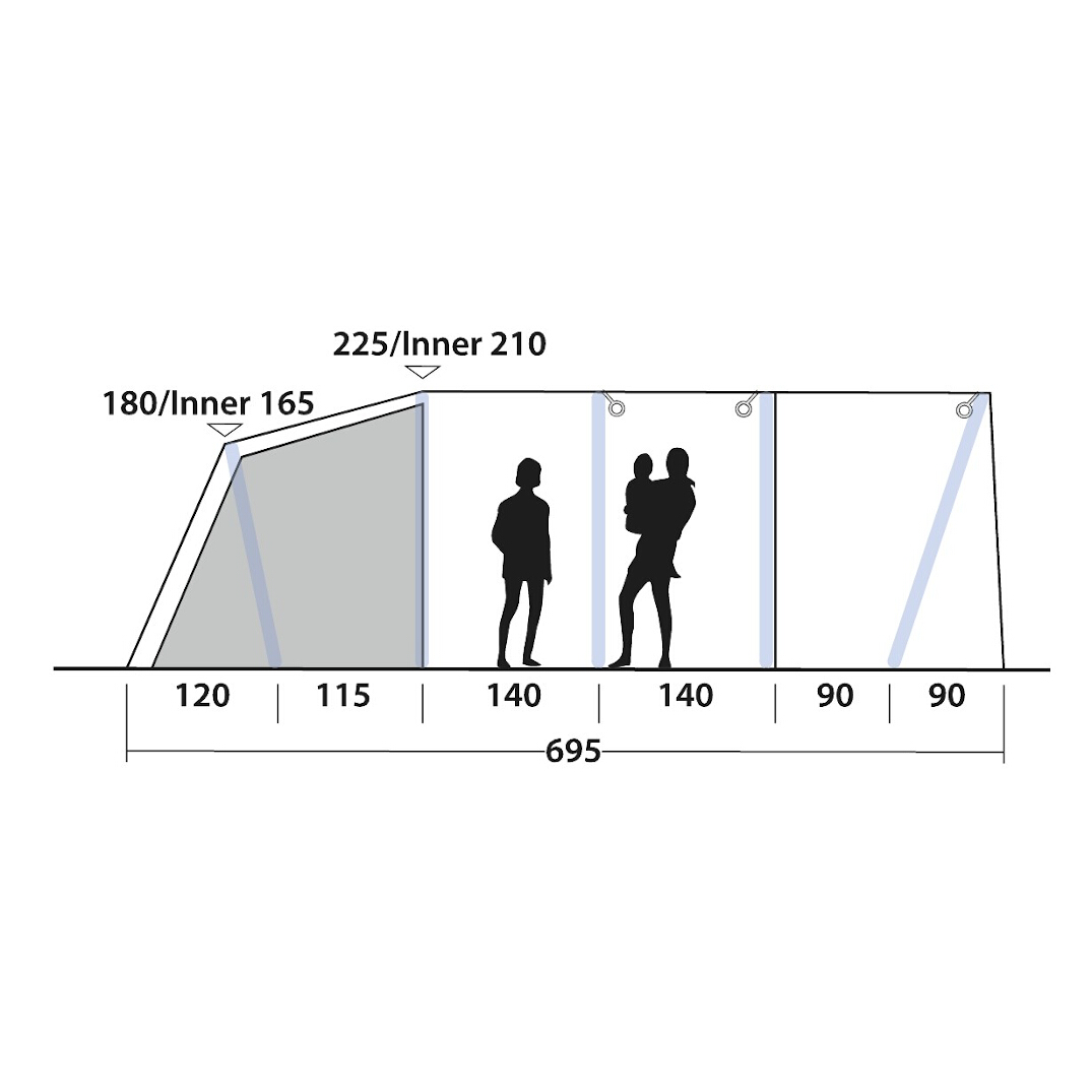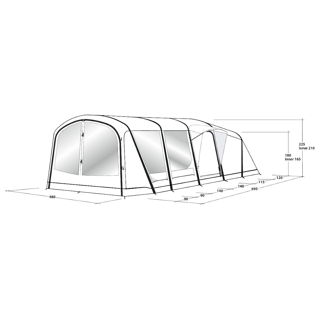 Outwell Sundale 7PA ist ein Zelt, das nicht nur so geräumig wie ein Wohnwagen ist, sondern dank Luftkanälen anstelle von Stangen auch genauso schnell aufgebaut werden kann. Das Familienzelt verfügt über drei dunkle Schlafräume, einen großen, hellen Wohnbereich mit fest angenähtem Boden sowie einen zusätzlichen Raum an der Front. Der zusätzliche Raum vorne kann auch geöffnet und als geschützter Außenbereich genutzt oder als Stauraum für Ausrüstung wie Fahrräder oder Kinderwagen verwendet werden. Perfekt für die größere Familie, die Familie mit älteren Kindern, die eigene Schlafzimmer haben möchten, oder für diejenigen, die einfach ein wirklich geräumiges Campingzelt wünschen.