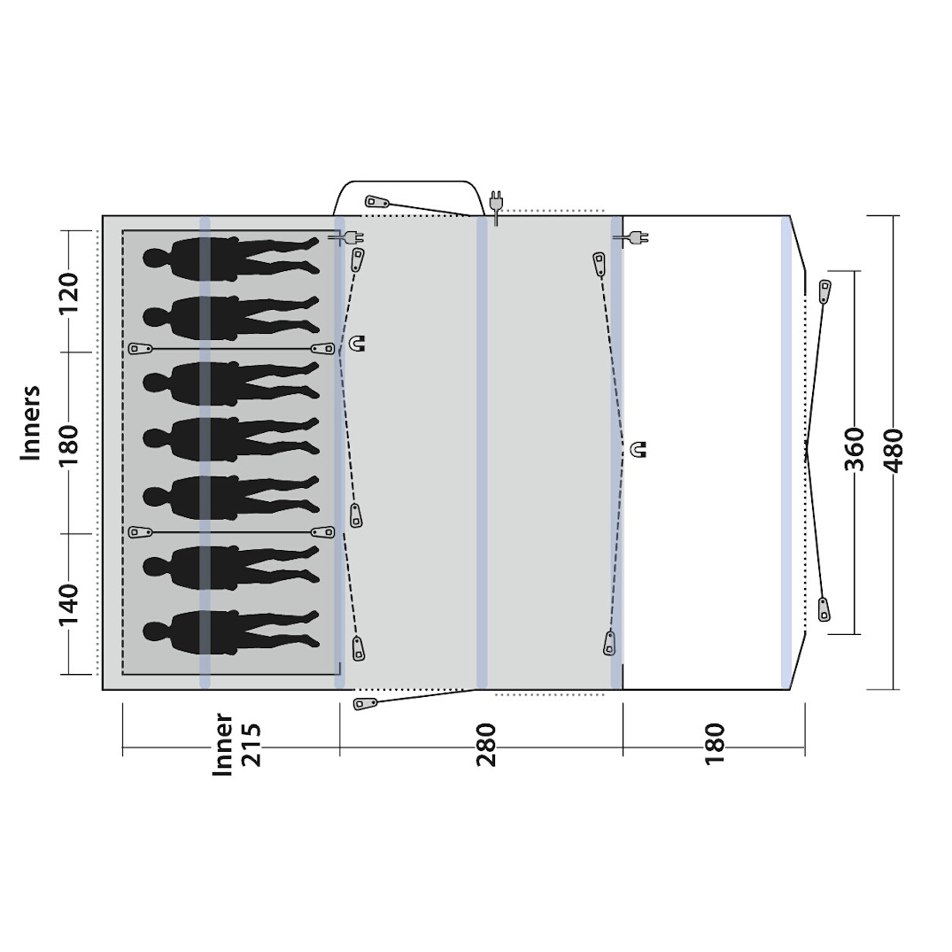 Die große Schlafkabine hinten im Zelt ist in drei Schlafzimmer (2+3+2) unterteilt. Die Wände zwischen den Schlafzimmern können entfernt werden, wenn man die ganze Familie in einem großen Schlafzimmer zusammenbringen möchte. Ein robuster, dunkler Stoff in der Schlafkabine sowie im Außenzeltstoff reduziert die Wirkung des schlimmsten Feindes vieler Zeltcamper, der Morgensonne. Die Schlafkabine hat auch einen Vorhang, der über die Belüftungsöffnung gerollt werden kann, um das Licht zu reduzieren, das durch die hintere Belüftung des Zeltes kommt.