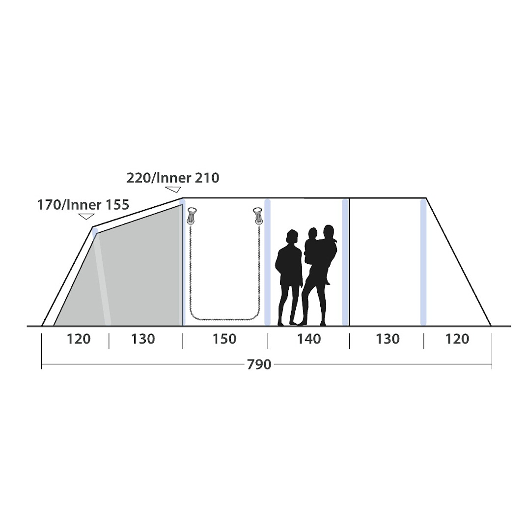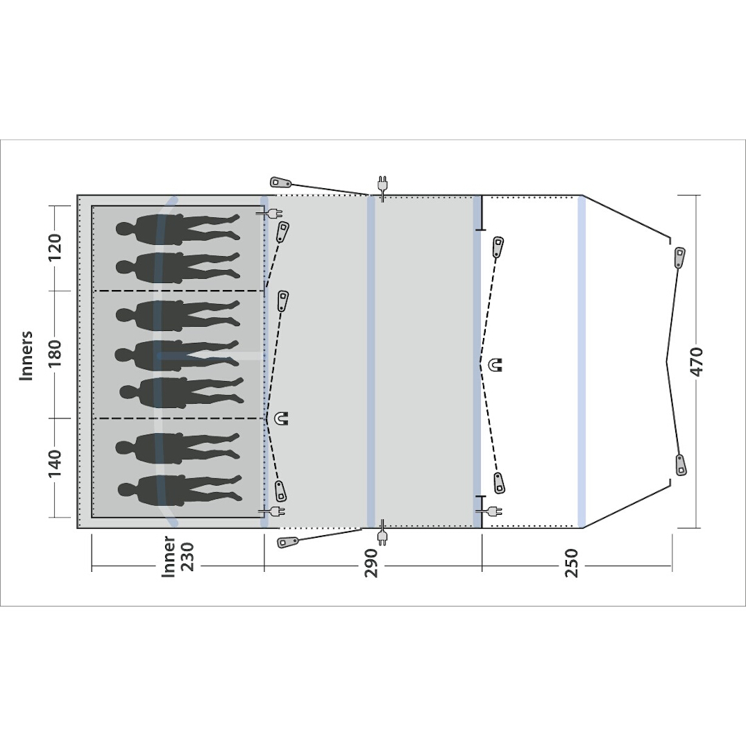 Das Zelt basiert auf drei Zonen. Ein Prinzip, das in England üblich ist und als Außenraum, Innenraum und Schlafzimmer bezeichnet wird. Der Außenraum mit abnehmbarem Boden kann entweder als Essbereich oder zum Aufhängen nasser Kleidung und zur Aufbewahrung von Ausrüstung genutzt werden. Die nächste Zone ist der normale Aufenthaltsraum mit festem Boden, in dem man idealerweise einen Teppich auslegen und für geselliges Beisammensein an Abenden oder Regentagen, an denen man nicht ständig ein- und ausgehen möchte, möblieren kann. Die letzte Zone sind die Schlafzimmer, die aus drei Schlafzimmern bestehen.
