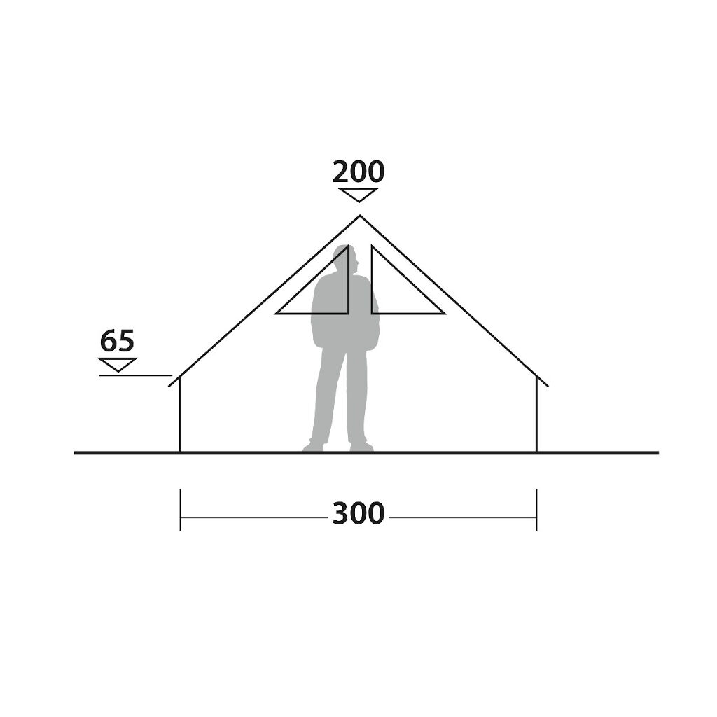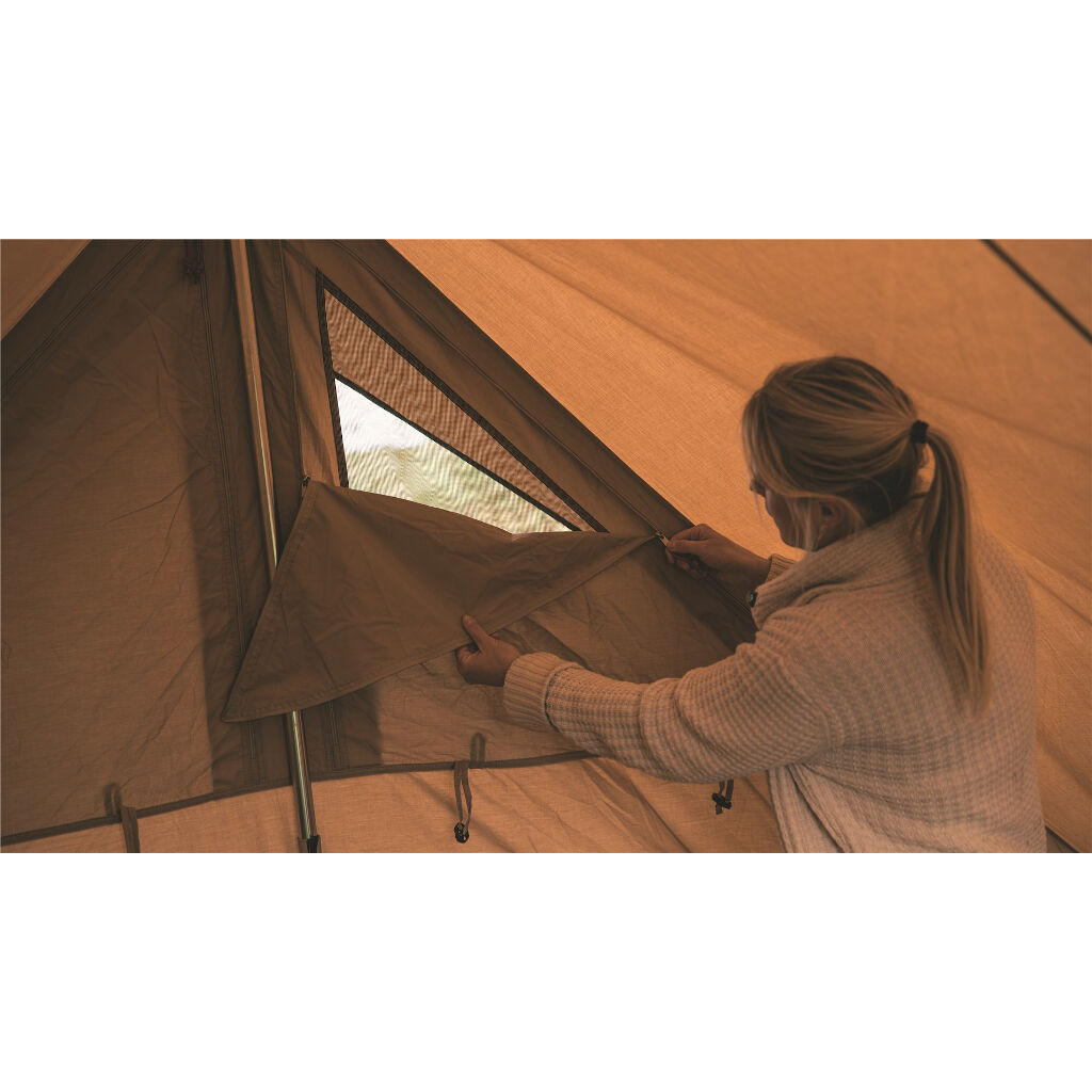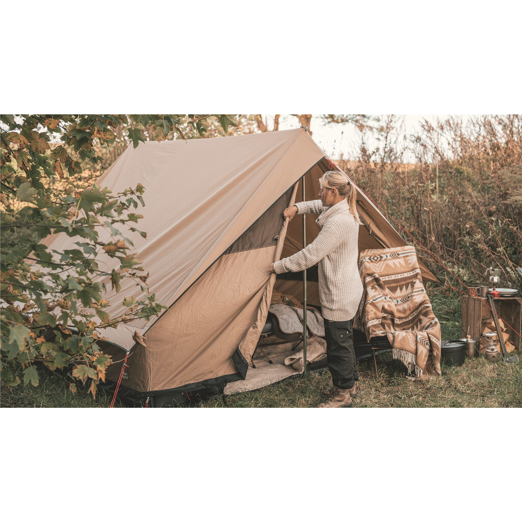 Das Zelt ist durch die große Öffnung vorne leicht zugänglich, die vollständig geöffnet werden kann, um das Zelt an warmen Tagen zu lüften. Zwei große, öffnungsfähige Belüftungsöffnungen sowohl vorne als auch hinten am Zelt dienen als Fenster, um mehr Licht hereinzulassen und das Zelt zu belüften. Robens Prospector Shanty kann auch mit einem Tarp vor dem Eingang ergänzt werden, um einen geschützten Bereich außerhalb des Zeltes zu schaffen. Das Zelt ist vom Typ mit Firststange und wird aufgebaut, indem die Beine und der First von innen montiert werden.
