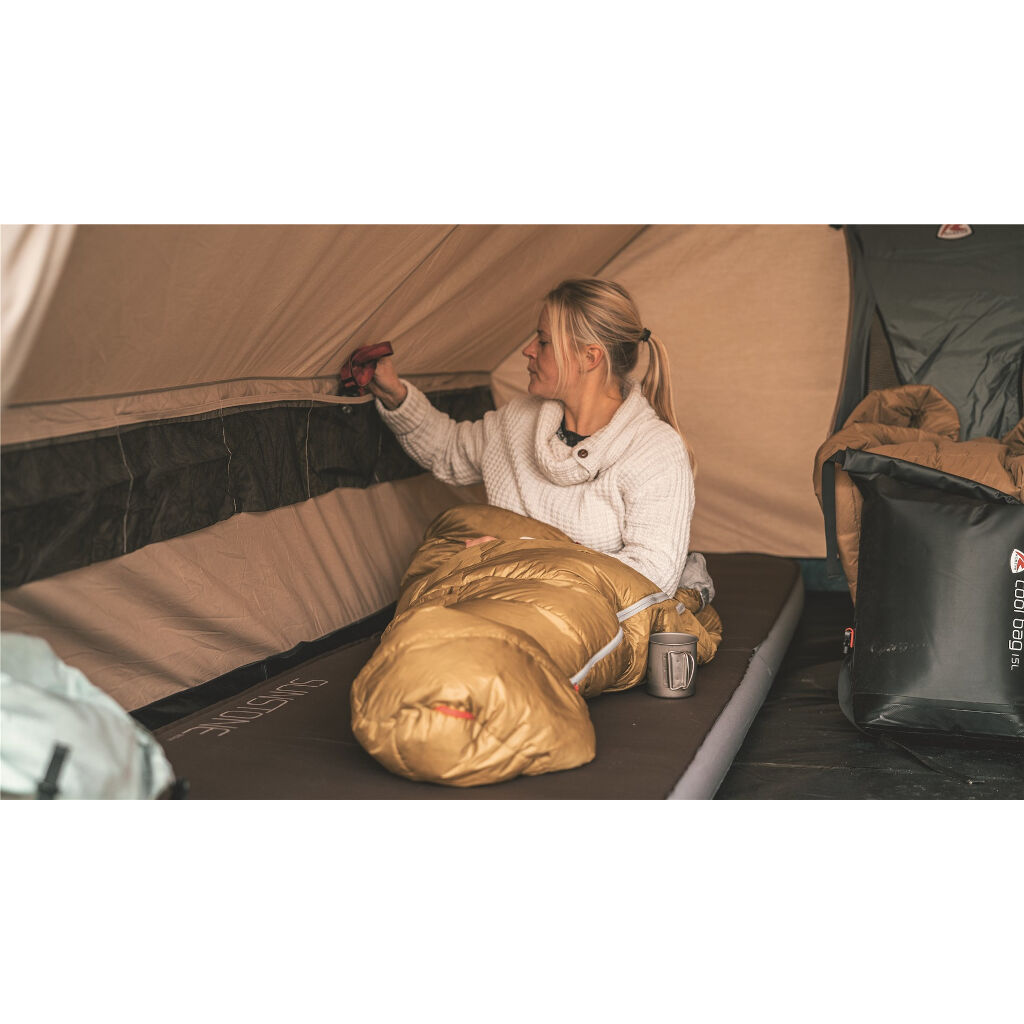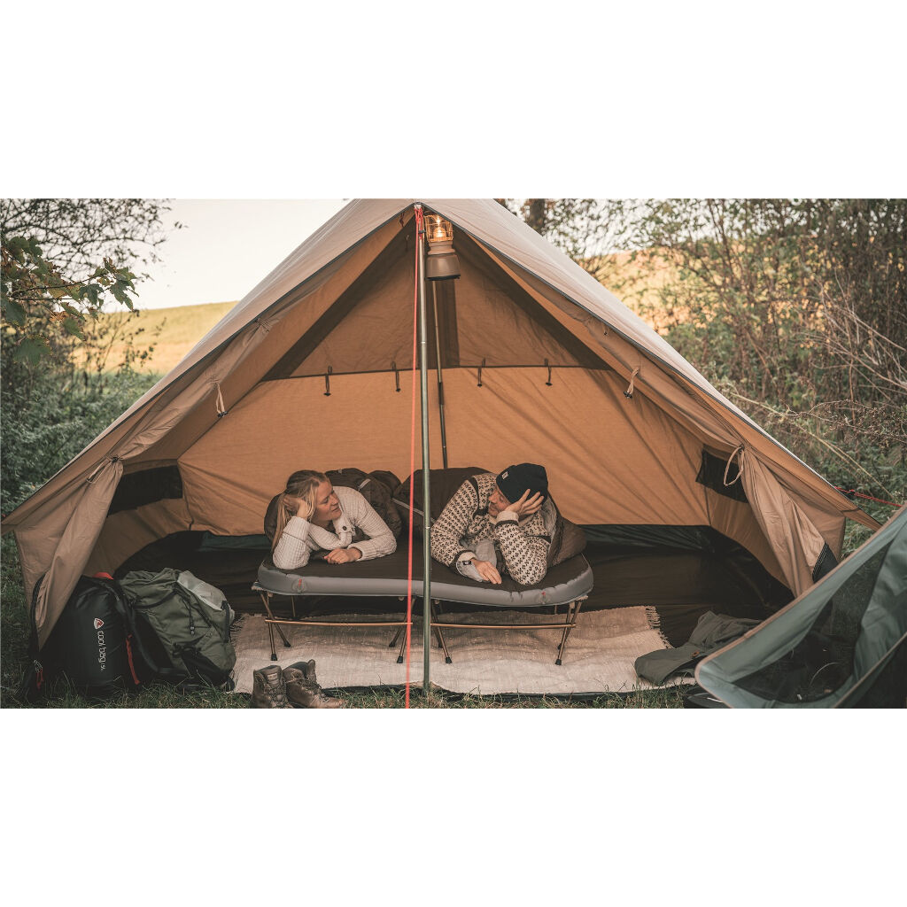 Robens Prospector Shanty ist für bis zu 6 Personen ausgelegt, eignet sich aber auch für Paare oder Familien mit einem oder zwei Kindern, die das Zelt mit Möbeln einrichten möchten, um darin Zeit zu verbringen. Durch die Mischung aus Baumwolle und Polyester bietet das Zelt ein deutlich besseres Innenklima als andere Zelte. Dies liegt daran, dass Baumwolle bei Wärme atmet und bei Kälte besser isoliert. Zudem sorgt sie für eine deutlich leisere Innenumgebung. Sie können sich also von dem Rascheln bei Wind und dem klassischen Zeltgeruch, der bei synthetischen Stoffen an warmen Tagen entsteht, verabschieden. Der Stoff ist sehr wasserbeständig, und bei stärkerem Regen quellen die Baumwollfasern im Stoff auf, wodurch der Stoff vollständig dicht wird. Die robuste Plane in Kombination mit dem Stahlrahmen ergibt ein äußerst stabiles Zelt, das Windgeschwindigkeiten von bis zu 195 km/h standhält.