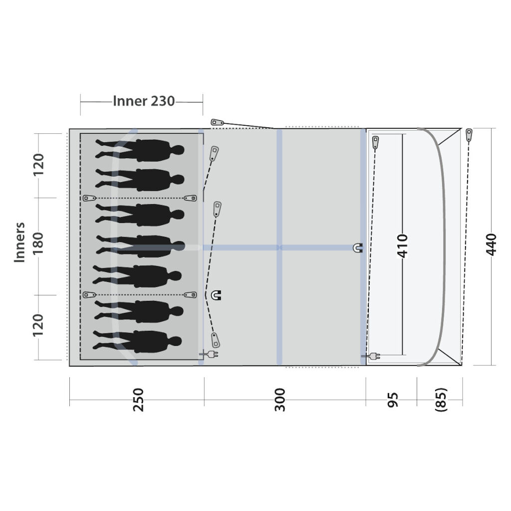Die Schlafkabine ist in drei Schlafzimmer (2+3+2) unterteilt. Die Wände zwischen den Schlafzimmern können entfernt werden, wenn Sie das Zelt in zwei Schlafzimmer aufteilen oder die Familie in einem großen Schlafbereich zusammenbringen möchten.