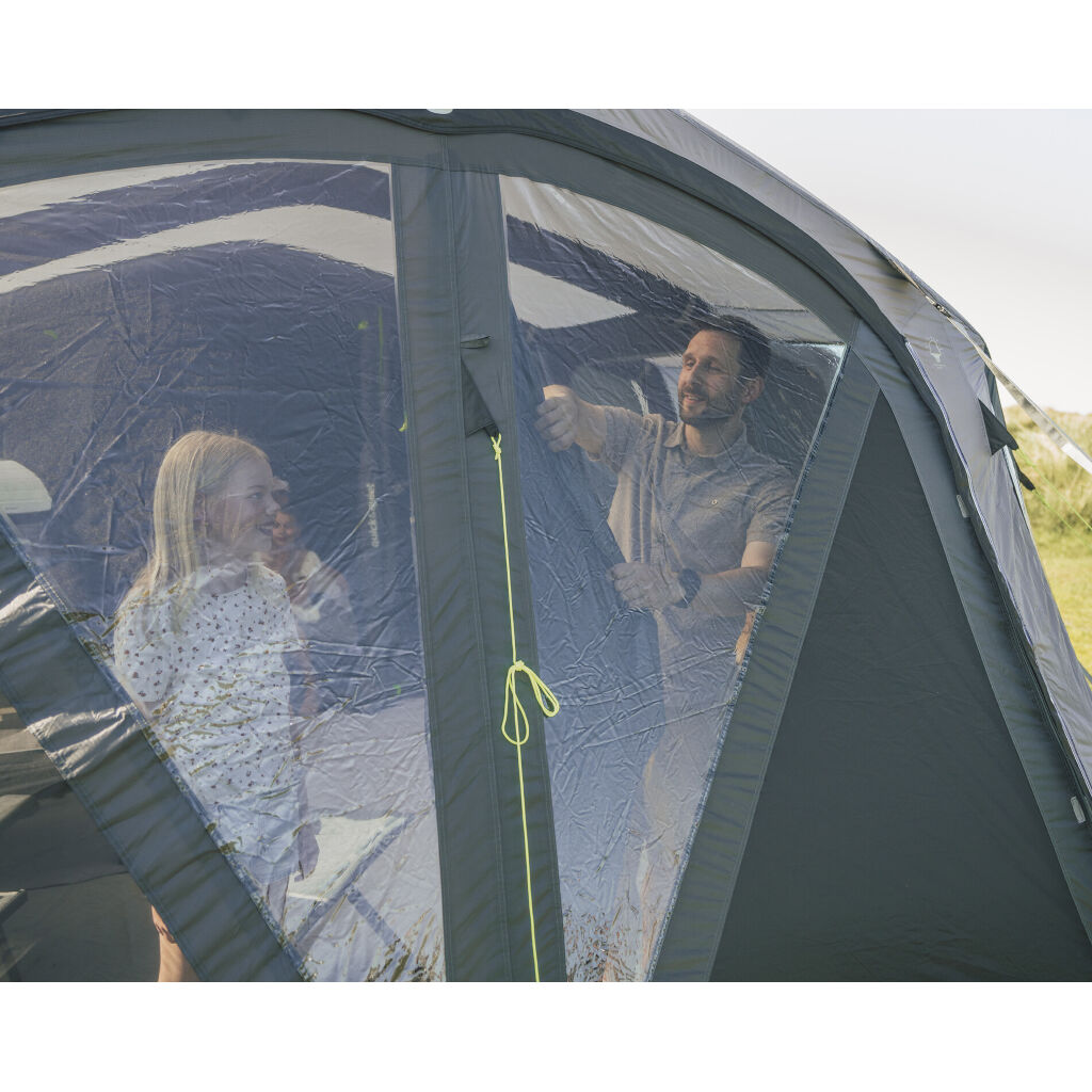 Das Vermont 7 Air bietet eine hervorragende Belüftung mit einer großen, regulierbaren Lüftungsöffnung auf der Rückseite, niedrigen Belüftungen bei den Wohnbereichsfenstern und großen Mesh-Paneelen in der Fronttür. Da der seitliche Eingang mit einer Netztür ausgestattet ist, kann das Zelt weiter geöffnet werden, um die Temperatur zu senken – auch bei hoher Insektenaktivität.