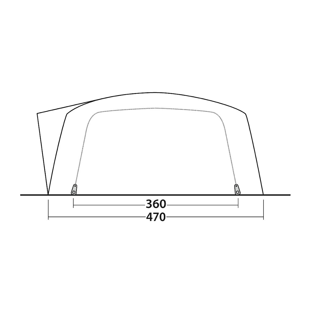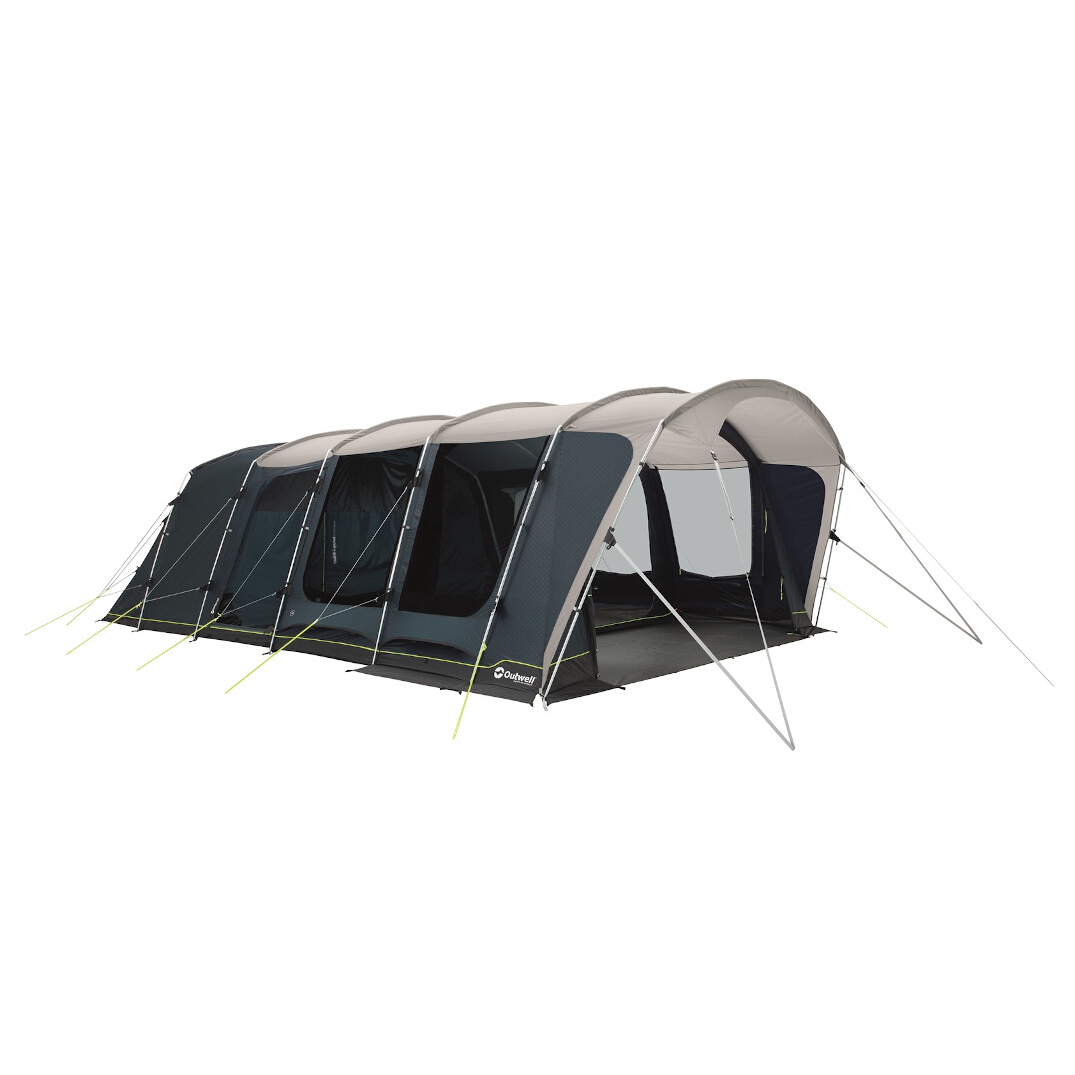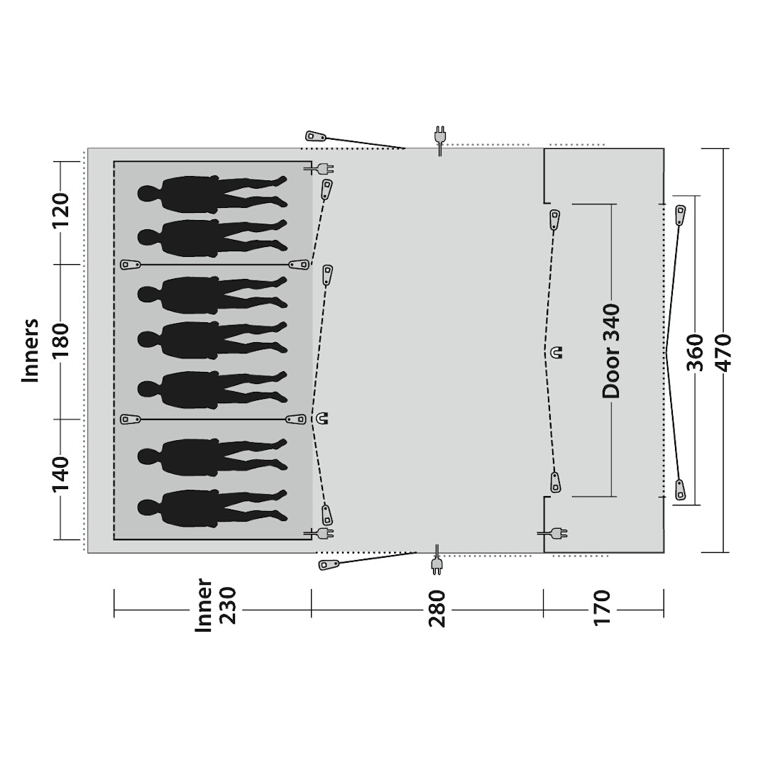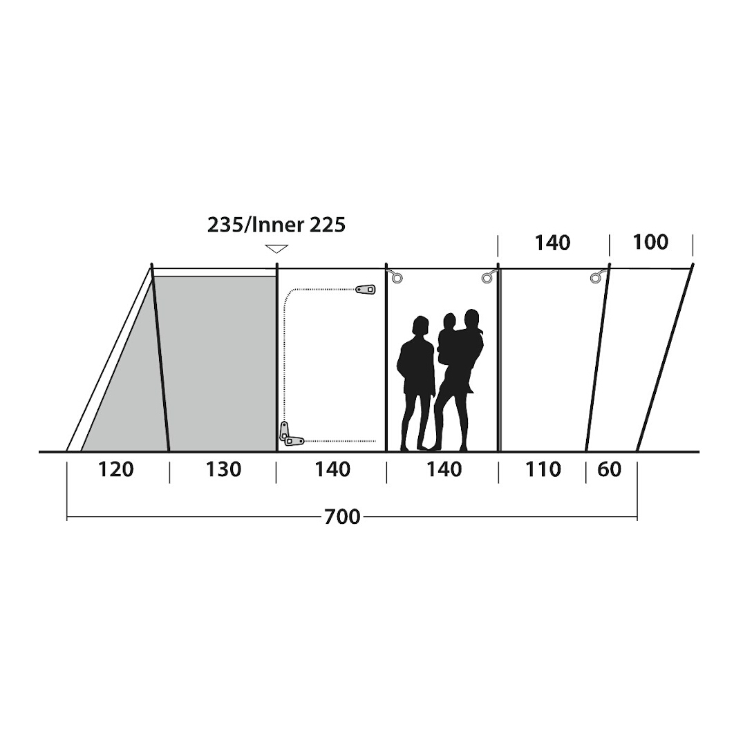 Die Schlafkabine ist in drei Schlafzimmer (2+3+2) unterteilt. Die Wände zwischen den Schlafzimmern können entfernt werden, wenn man zwei Schlafzimmer haben möchte oder die ganze Familie in einem großen Schlafzimmer unterbringen möchte. Ein einzigartiges Detail ist die extra geräumige Schlafkabine (Outwell Ambassador Master Bedroom), die sowohl in der Länge als auch in der Höhe mehr Platz bietet als normale Zeltkabinen, bei denen die Betten die gesamte Länge einnehmen und die Rückwand oft in großen Teilen des Raumes niedrige Höhe bietet. Perfekt, um Gepäck in die Schlafkabine zu bringen oder einfach nur etwas mehr Platz zum Bewegen zu haben.