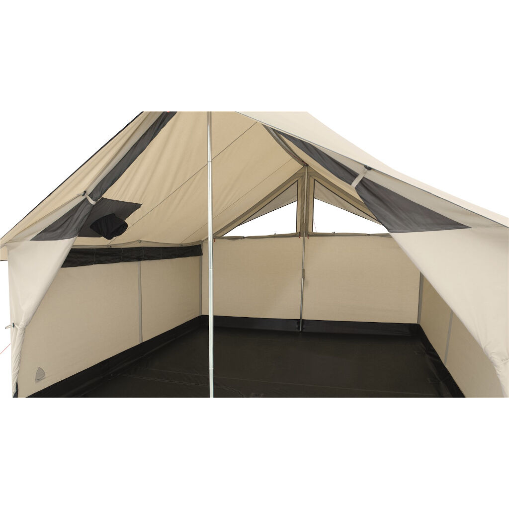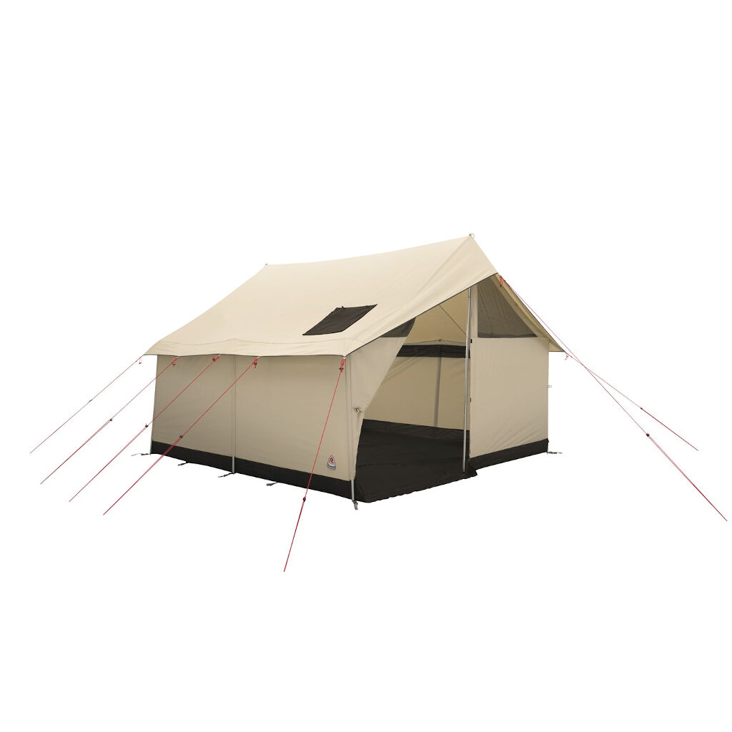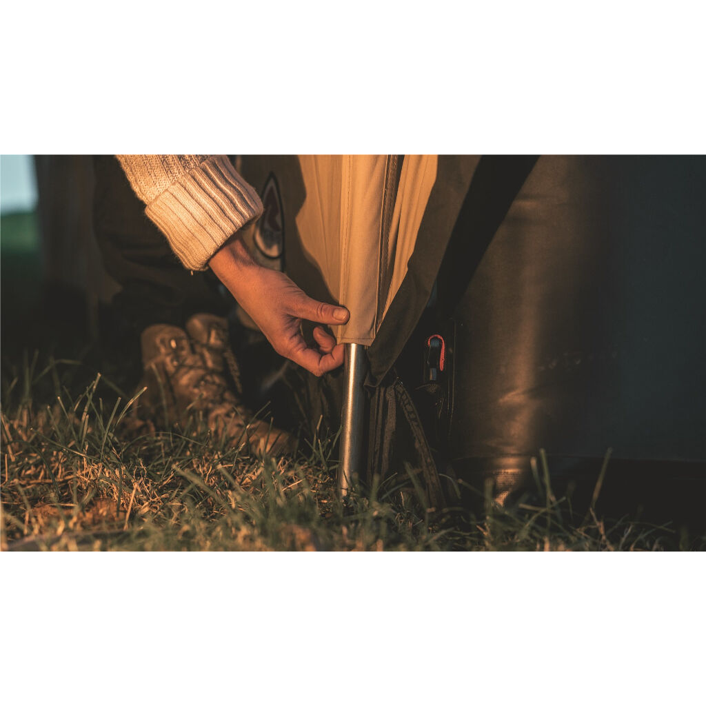 Das Zelt ist durch die große Öffnung vorne leicht zugänglich, die an warmen Tagen komplett geöffnet werden kann, um das Zelt zu lüften. Zwei große öffnungsfähige Lüftungen vorne und hinten am Zelt dienen als Fenster, um mehr Licht hereinzulassen und das Zelt zu belüften. Das Dach ist für einen Ofen vorbereitet und der Boden hat eine mit Reissverschluss öffnungsfähige Klappe, damit der Ofen oder Funken aus der Klappe den Boden nicht beschädigen können. Das Robens Prospector Castle hat auch gute Zubehörmöglichkeiten und kann mit einem Ofen, einer Plane für den Eingang sowie einem Innenzelt für 5 Personen ergänzt werden. Das Zelt wird aufgebaut, indem die Seitenstangen in die äußeren Stangenkanäle eingeführt und die Seile gespannt werden. Der First mit Beinen wird dann von innen im Zelt montiert.