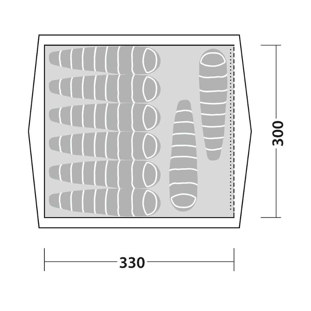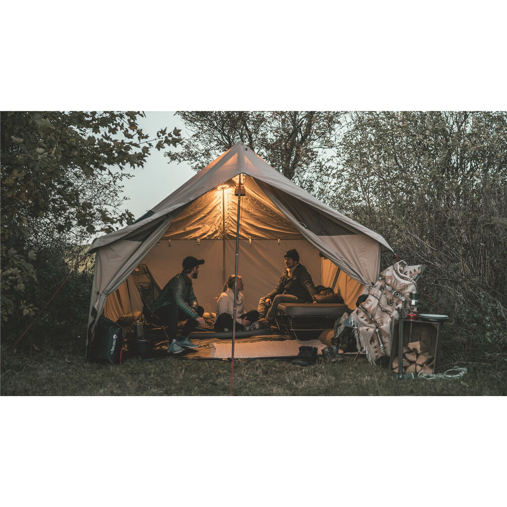 Geräumiges Lagerzelt für bis zu 8 Personen mit strapazierfähigem Gewebe aus technischer Baumwolle, festem Boden und stabilem Stahlrahmen. Das Zelt kann mit einem Innenzelt für 5 Personen, einem Zeltofen und einer Plane, die an der Vorderseite montiert wird, ergänzt werden.