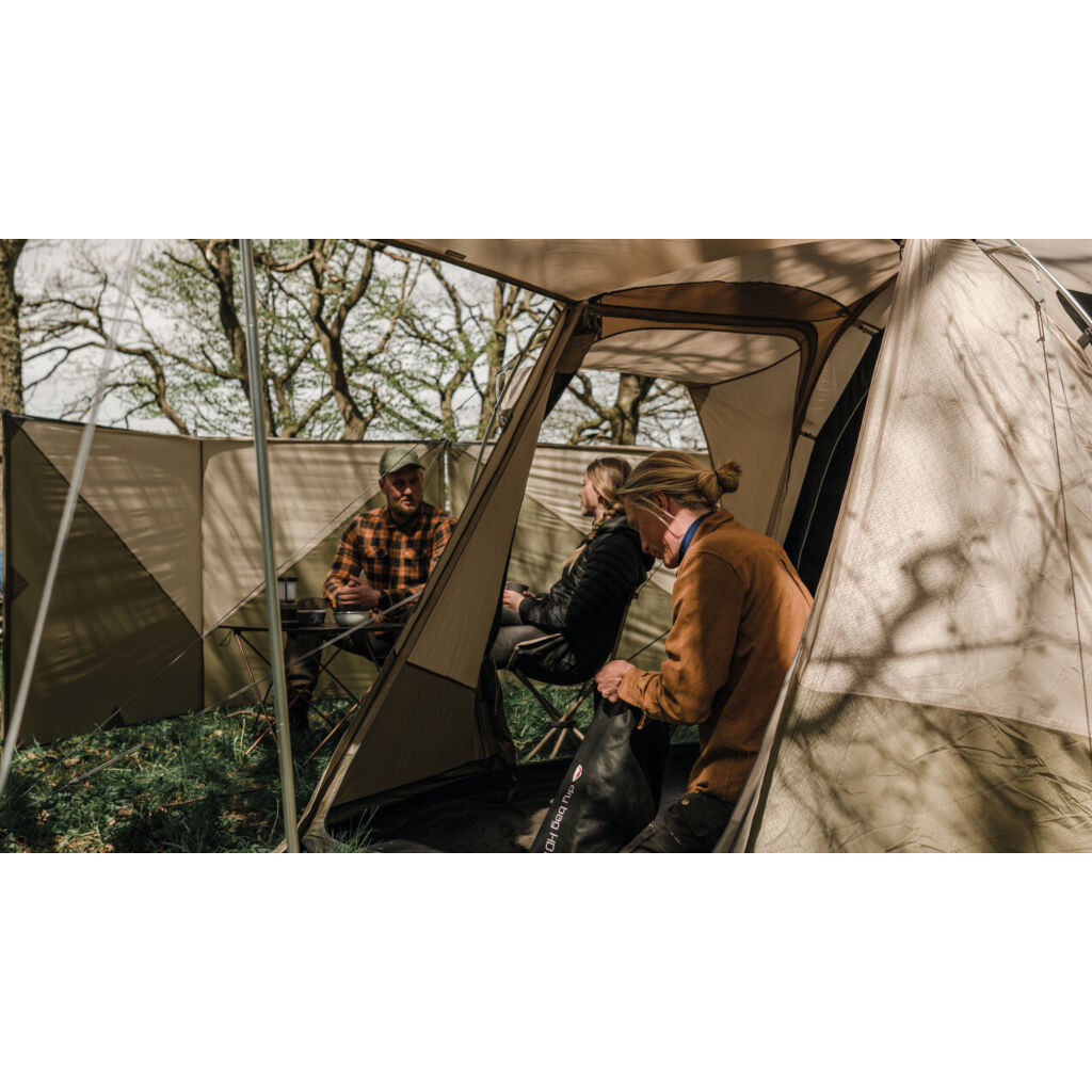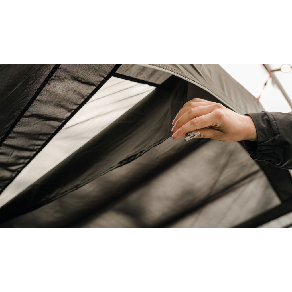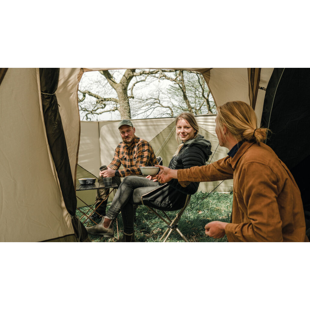 Das Zelt verfügt über eine großzügige Belüftung mit doppelten Lüftungsöffnungen hinten und niedrigen Lüftungsöffnungen vorne. Ein cleveres Detail sind die Fenster und Türen in der Apsis (Vorraum), die drei Schichten mit Vorhängen, Fenstern und außen Moskitonetzen haben. Dies bietet sehr gute Möglichkeiten, das Zelt an warmen Tagen zu lüften. Die Apsis ist sowohl über den regengeschützten Seiteneingang als auch über die Front zugänglich. Der eingenähte Boden schützt vor Zugluft und kleinen Insekten und reduziert gleichzeitig die Kondensation im Zelt. Die dunkle Schlafkabine mit zwei Schlafzimmern schützt vor der Morgensonne. Die Trennwand kann auch geöffnet werden, um die Familie in einem großen Schlafzimmer zu versammeln.