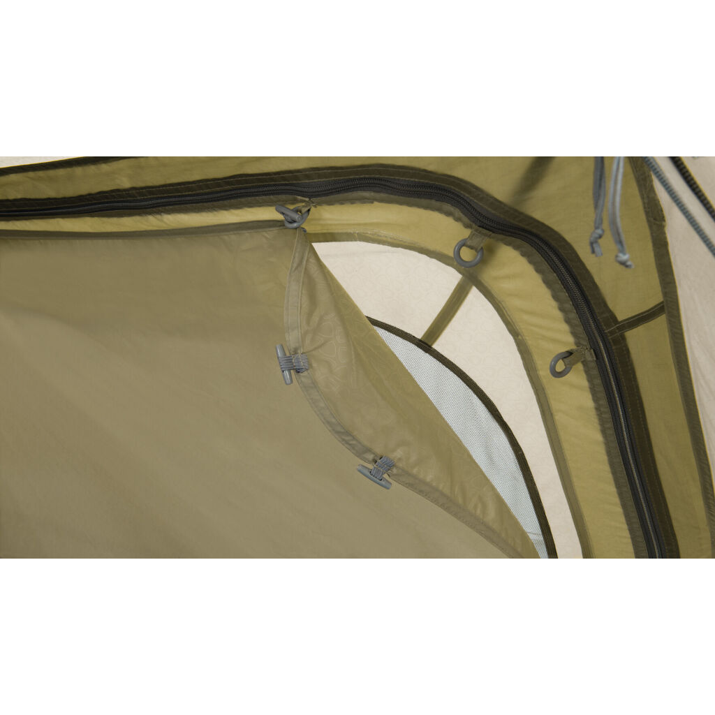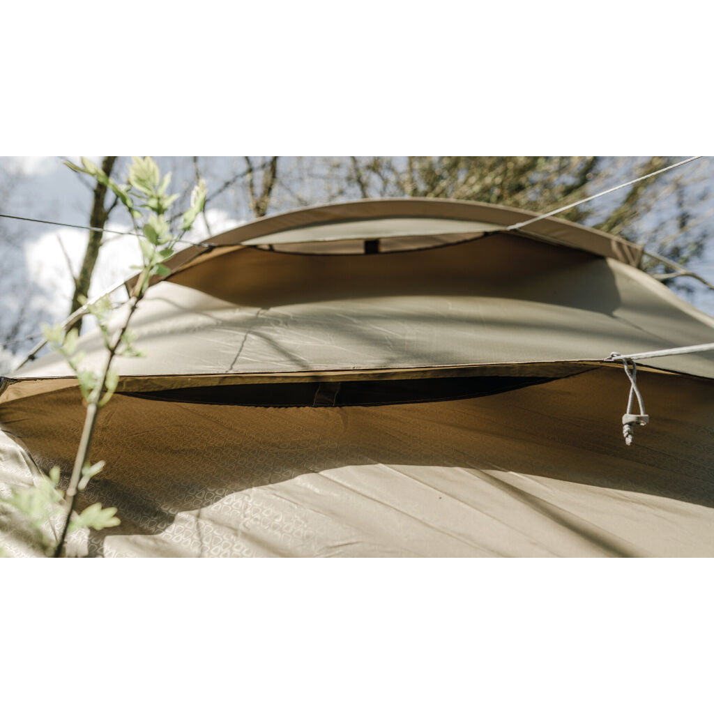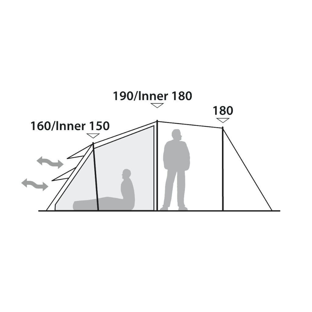 Das Zelt verfügt über eine großzügige Belüftung mit doppelten Lüftungsöffnungen hinten und niedrigen Lüftungsöffnungen vorne. Ein cleveres Detail sind die Fenster und Türen in der Apsis (Vorraum), die drei Schichten mit Vorhängen, Fenstern und außen Moskitonetzen haben. Dies bietet sehr gute Möglichkeiten, das Zelt an warmen Tagen zu lüften. Die Apsis ist sowohl über den regengeschützten Seiteneingang als auch über die Front zugänglich. Der eingenähte Boden schützt vor Zugluft und kleinen Insekten und reduziert gleichzeitig die Kondensation im Zelt. Die dunkle Schlafkabine mit zwei Schlafzimmern schützt vor der Morgensonne. Die Trennwand kann auch geöffnet werden, um die Familie in einem großen Schlafzimmer zu versammeln.