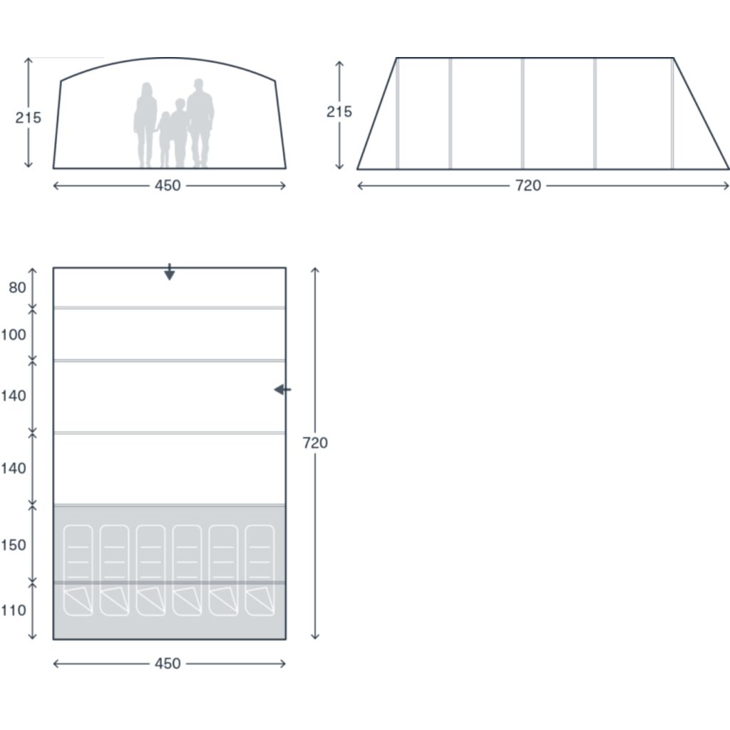 Das Saunton AIR 06 ist ein Familienzelt für bis zu 6 Personen. Wir empfehlen es auch für Familien mit drei Kindern, da der zusätzliche Platz in den Schlafkabinen Raum für Gepäck und breitere Betten bietet. Der großzügige Wohnbereich mit großen Fenstern sorgt für eine helle und angenehme Atmosphäre – unabhängig vom Wetter gibt es ausreichend Platz zum Essen und Entspannen. Die große Frontöffnung kann in zwei Abschnitten geöffnet werden – vollständig für warme Tage oder teilweise für zusätzlichen Schutz vor Wind und Einblick. Ein fest eingenähter Zeltboden schützt vor Wind, Insekten und Schmutz.