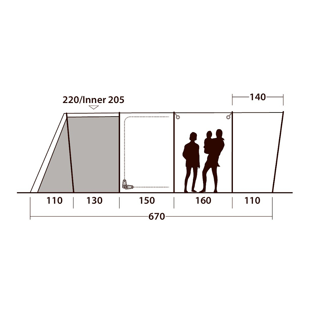 Die Schlafkabine ist in drei Schlafzimmer (2+2+2) unterteilt. Die Wände zwischen den Schlafzimmern können entfernt werden, wenn man die ganze Familie in einem großen Schlafzimmer versammeln oder die Familie in ein großes und ein kleineres Schlafzimmer aufteilen möchte. Ein einzigartiges Detail ist die extra geräumige Schlafkabine (Outwell Ambassador Bedroom), die sowohl in der Länge als auch in der Höhe mehr Platz bietet als normale Zeltkabinen, bei denen die Betten die gesamte Länge einnehmen und die Rückwand oft in großen Teilen des Raumes niedrige Höhe bietet. Perfekt, um Gepäck in die Schlafkabine zu bringen oder einfach nur etwas mehr Platz zum Bewegen zu haben.