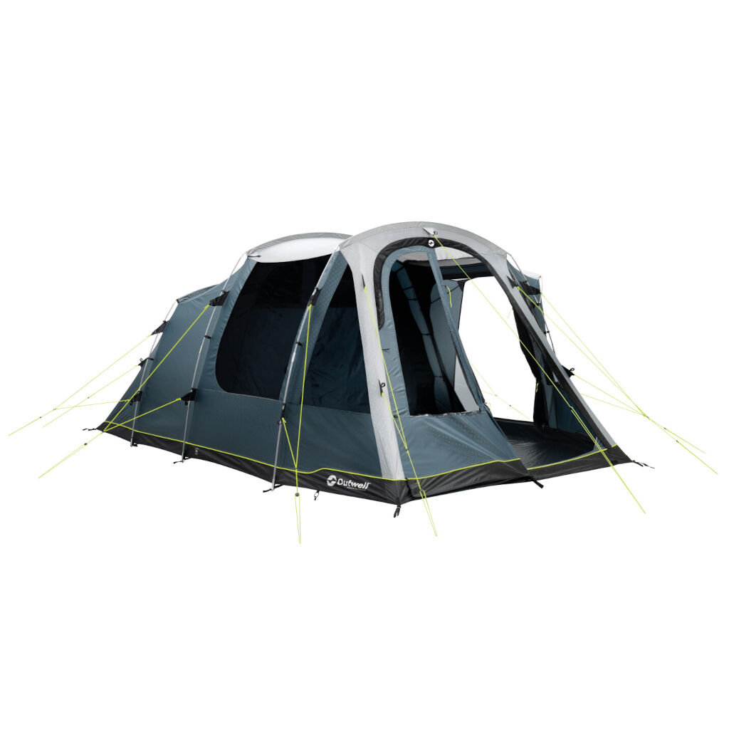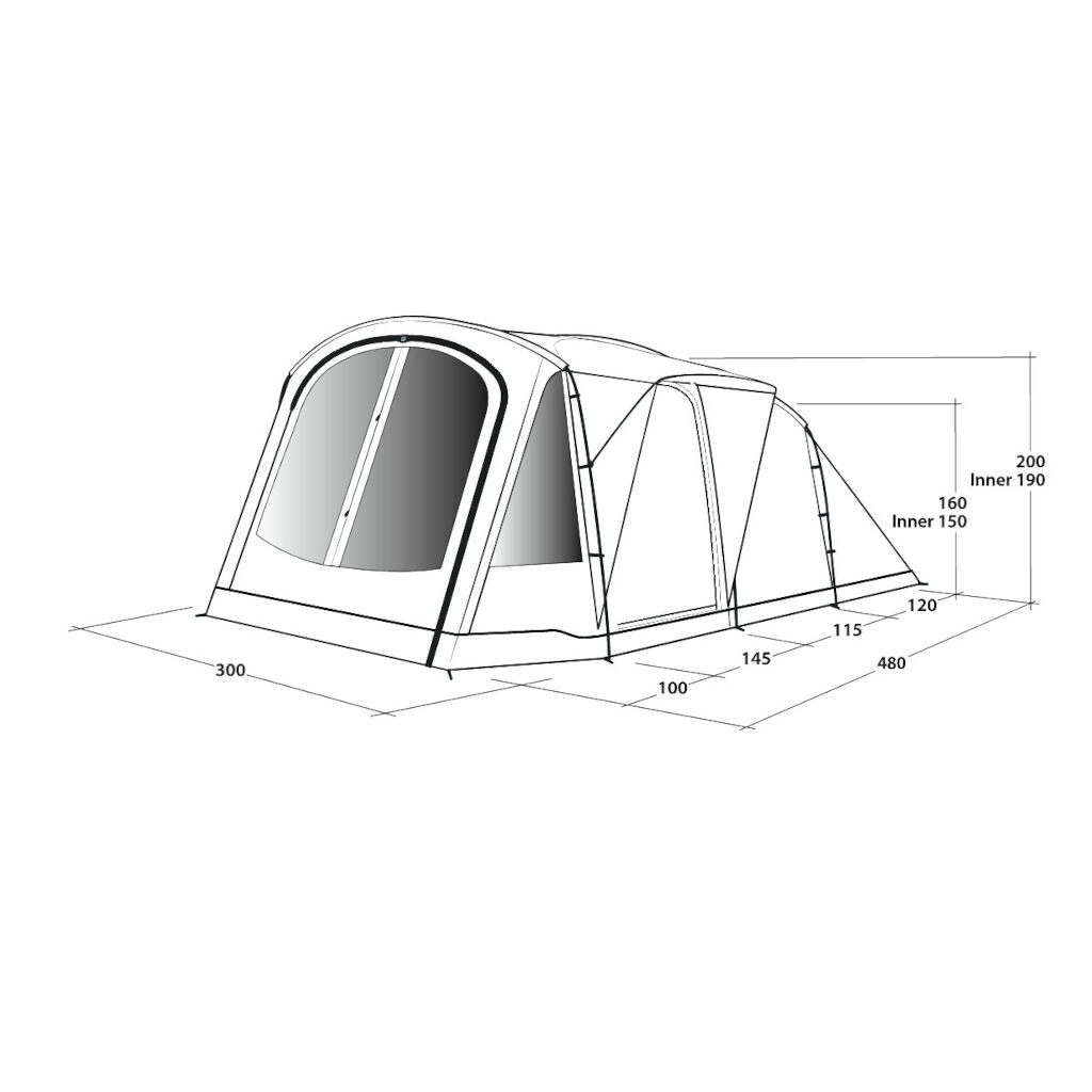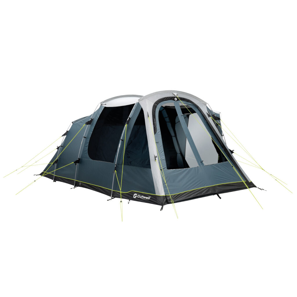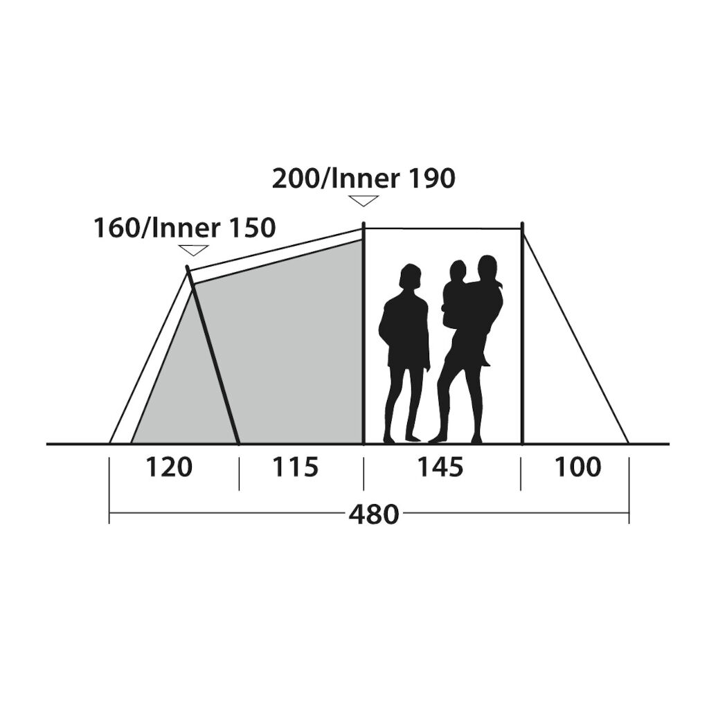 Leicht aufzubauendes Familienzelt für fünf Personen mit zwei dunklen Schlafkabinen und einem Wohnbereich mit Stehhöhe. Große getönte Fenster in drei Richtungen sorgen für einen hellen und angenehmen Wohnbereich. Zwei Eingänge, von denen einer regengeschützt ist, machen das Zelt leicht zu platzieren. Eingenähter Boden im gesamten Zelt schützt vor Zugluft, Feuchtigkeit und Insekten.