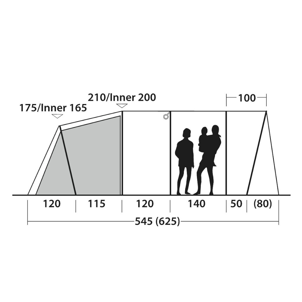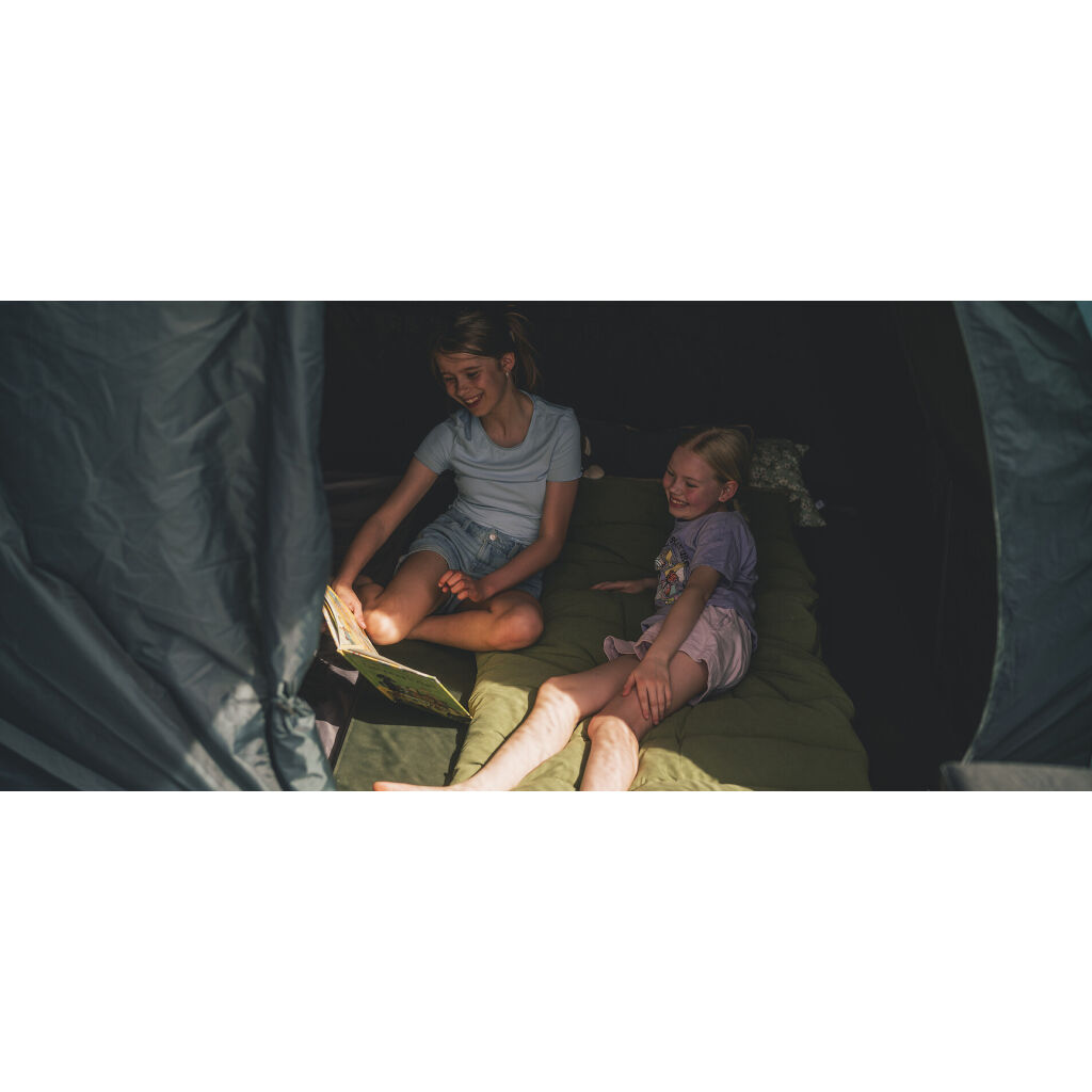 Die Schlafkabine im Outwell Denver 5 ist in zwei Schlafräume mit Platz für zwei bzw. drei Personen unterteilt. Die Trennwand zwischen den Schlafräumen kann entfernt werden, um einen großen Schlafraum zu schaffen. Ein stärkeres dunkles Gewebe in der Schlafkabine sowie im Außenzelt darüber reduziert die Wirkung der Morgensonne – dem größten Feind vieler Camper. Die Schlafkabine verfügt außerdem über einen Vorhang, der über die Belüftungsöffnung gerollt werden kann, um den Lichteinfall weiter zu reduzieren.