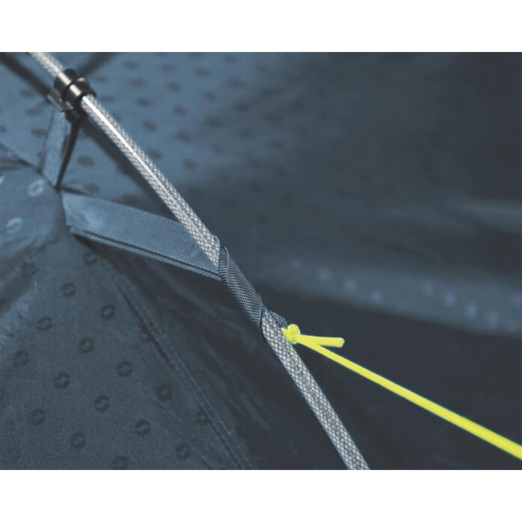 Das Zelt bietet eine gute Belüftung durch die breite, regulierbare Lüftungsöffnung auf der Rückseite. Das Außenzelt ist vollständig wasserdicht mit versiegelten Nähten und flammhemmend behandelt. Das Innenzelt muss beim Zusammenpacken nicht entfernt werden. Die Gestänge sind farbmarkiert für einen einfachen Aufbau.