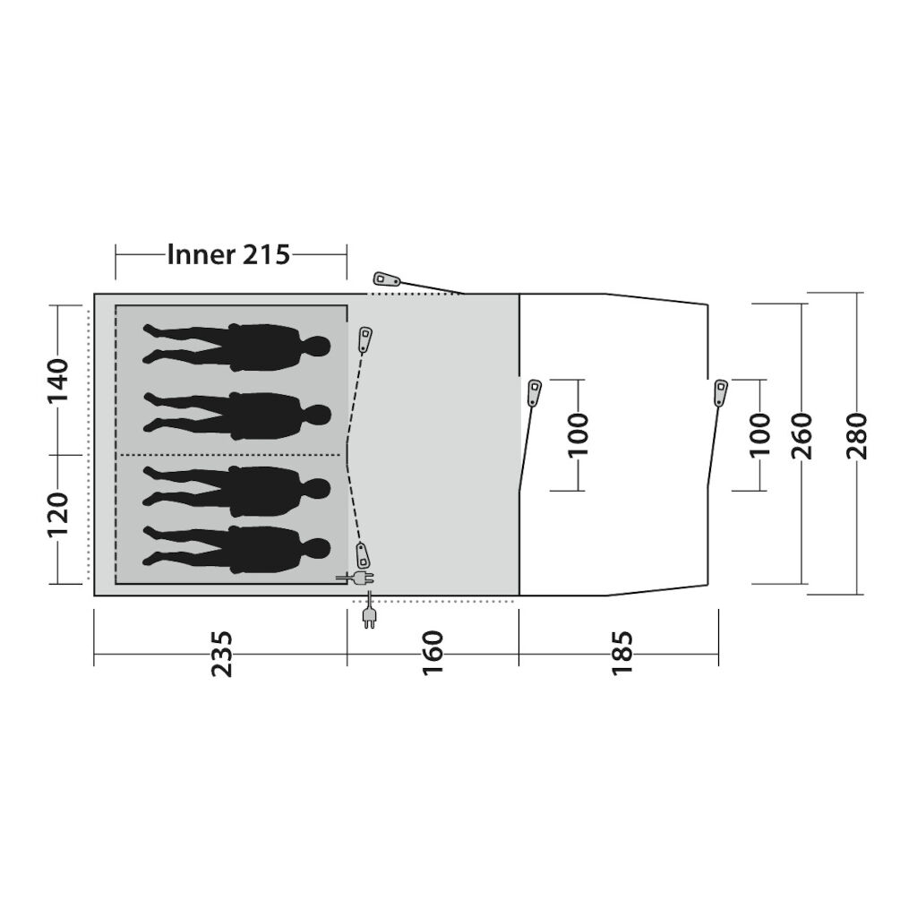 ist ein praktisches Tunnelzelt für 4 Personen – ideal für Familiencamping. Mit einer durchdachten Dreizonen-Aufteilung bietet das Zelt sowohl Komfort als auch Flexibilität. Das vordere Innenzelt kann je nach Bedarf einfach als zusätzliches Schlafzimmer oder als Stauraum genutzt werden und lässt sich entfernen, um die Wohnfläche zu vergrößern.