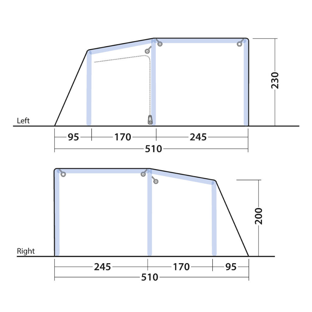 Dank Outwells One Air System lässt sich das Zelt schnell und einfach über ein einziges Ventil auf- und abbauen. Für zusätzlichen Komfort verfügt das Zelt über dunkle Wände und Decken in den Schlafkabinen, einen vollständig eingenähten Zeltboden zum Schutz vor Wetter und Insekten sowie regensichere Türen. Das Virginia 5 Air TC ist die perfekte Wahl für Familien oder Paare, die beim Camping keine Kompromisse eingehen möchten – eine Kombination aus Funktionalität, Luxus und Stil.