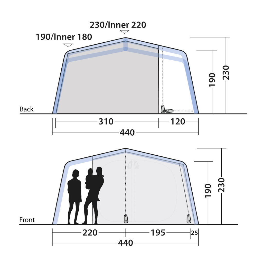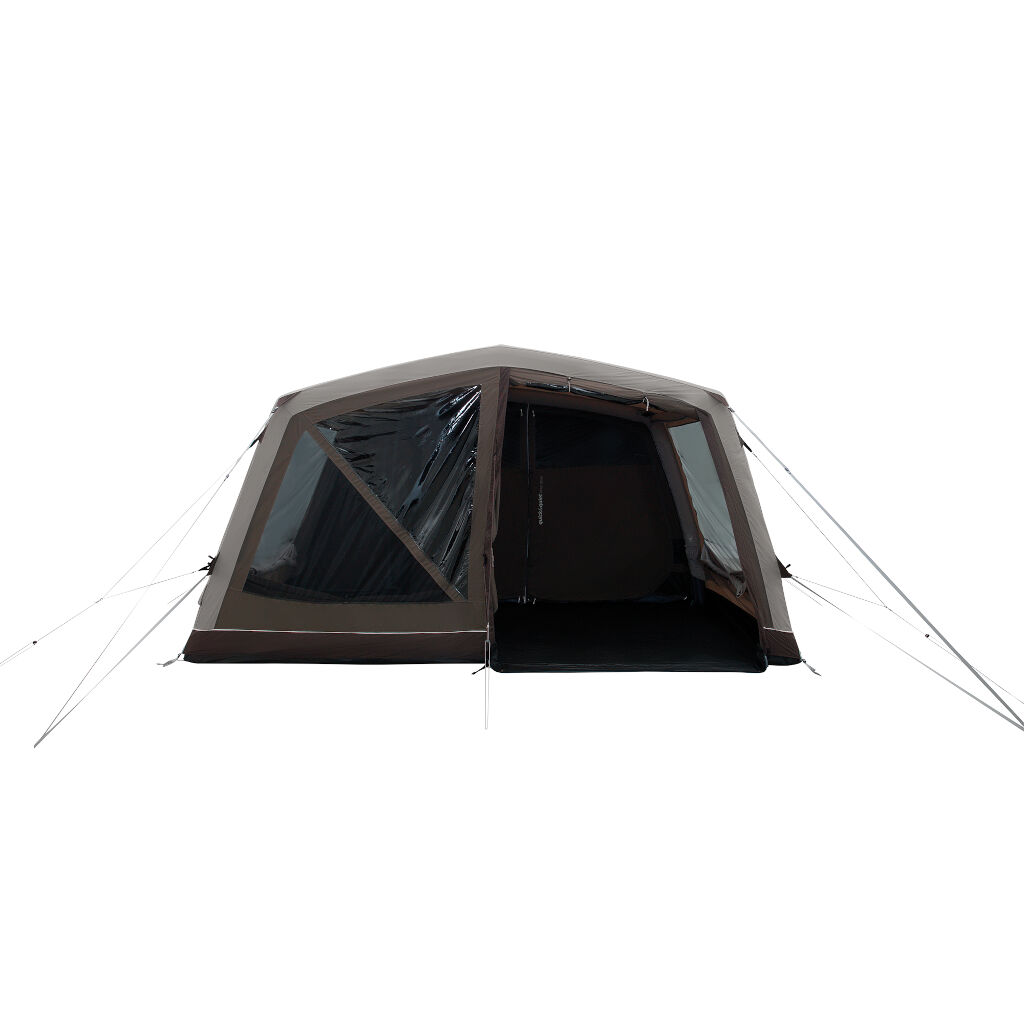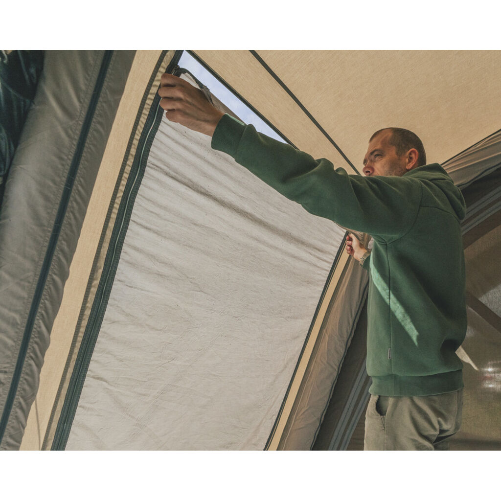 Das kubische Design und die vorgeformten Luftschläuche sorgen für eine großzügige Stehhöhe und bessere Bewegungsfreiheit. Getönte Fenster und flexible Vorhänge reduzieren Wärme und Einblicke von außen, während die Belüftung im hinteren Bereich und in den Seitentüren auch an warmen Tagen für eine gute Luftzirkulation sorgt. Dank des One Air Systems lässt sich das Zelt schnell über ein einziges Ventil aufbauen, und der vollständig eingenähte Zeltboden schützt vor Wind, Insekten und Schmutz.