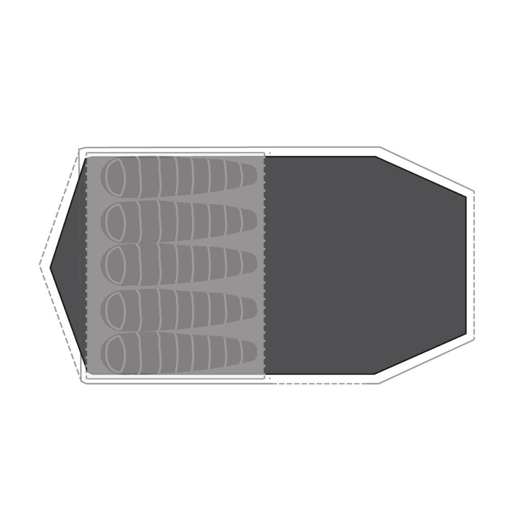 Zeltunterlage für das Zelt Robens Paso Flex 5. Reduziert die Feuchtigkeit, die vom Boden ins Zelt eindringt, und bietet eine trockene Fläche zum Lagern und Kochen. Schützt das Zelt zudem vor Abnutzung und Beschädigungen.
